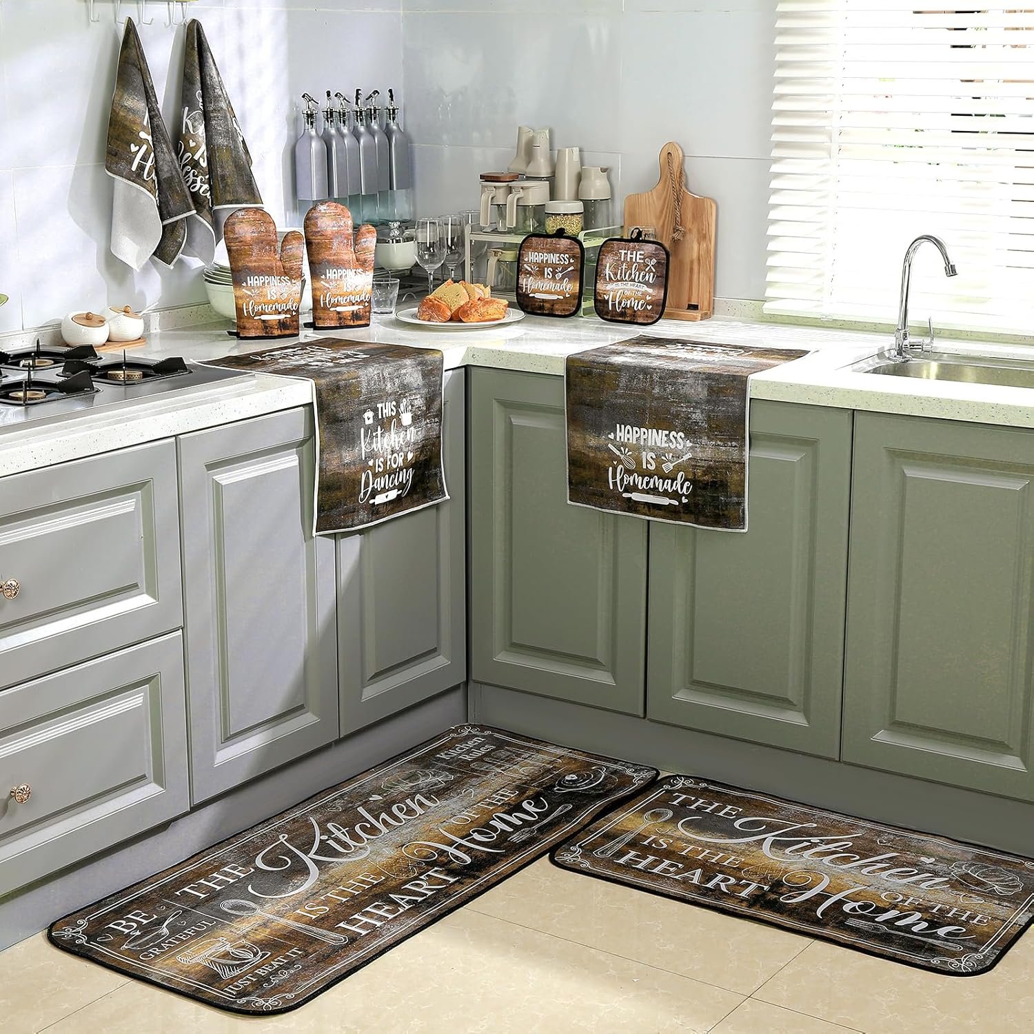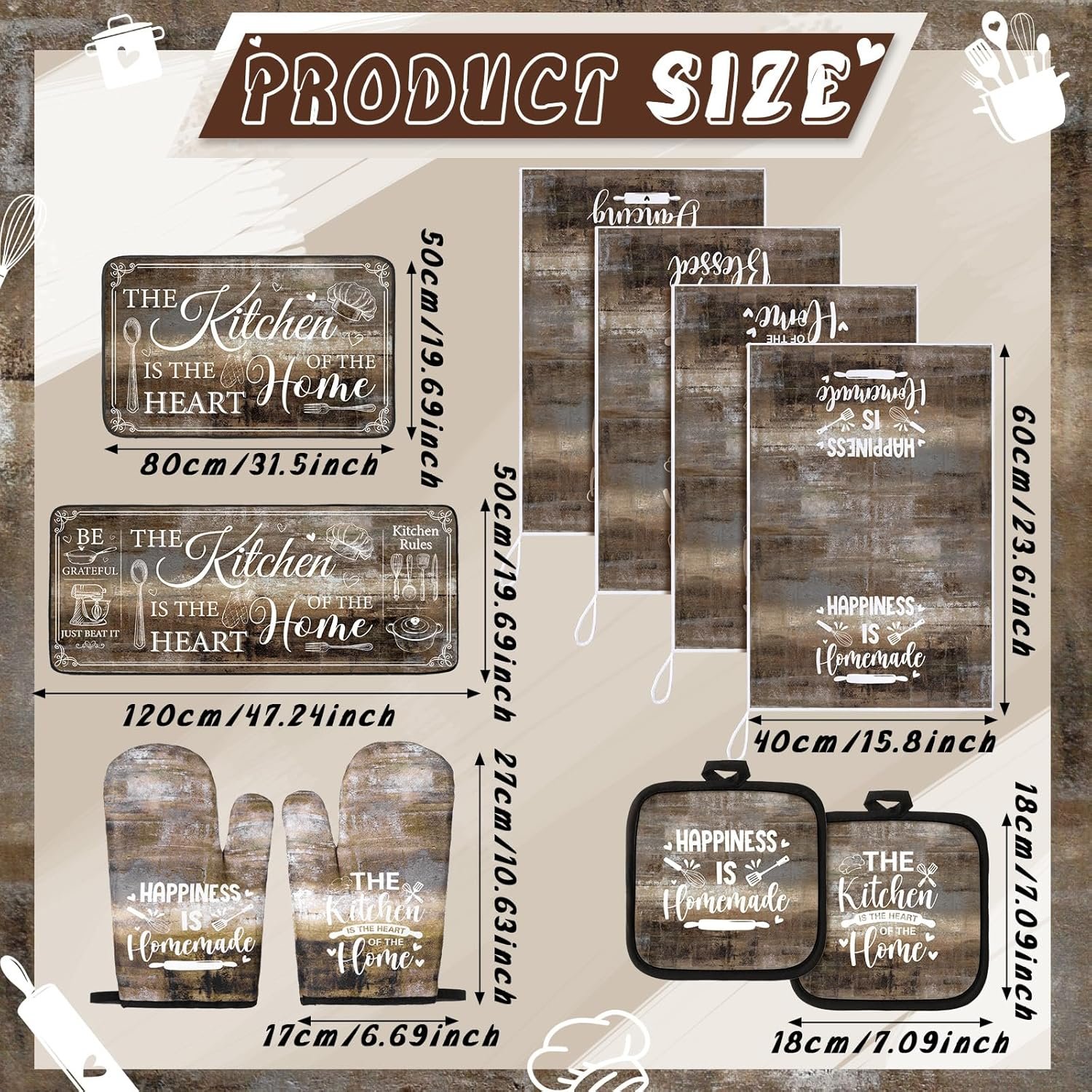 Proper Size: the kitchen towels measure 15.75 x 23.62 inches, the kitchen rugs are 31.5 x 19.69 inches and 47.24 x 19.69 inches, the kitchen pot holders are 7.09 x 7.09 inches, and the kitchen oven mitts are 6.69 x 10.63 inches, fitting well in various kitchens