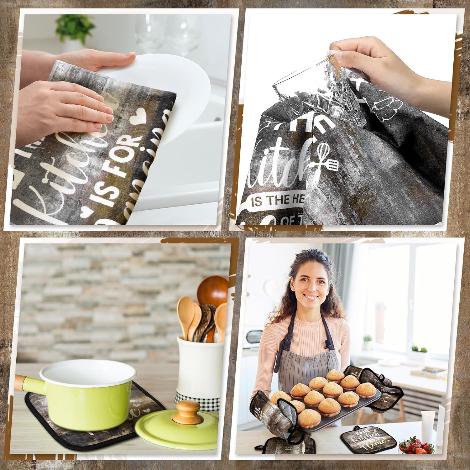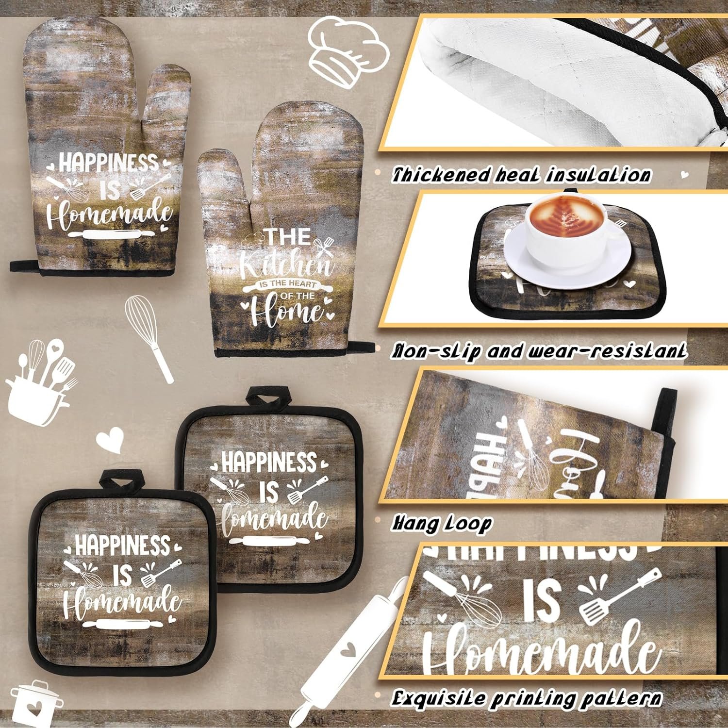 Heat Resistant Material: the kitchen accessories set is crafted with reliable quality in mind, the towels made from superior microfiber, ensuring nice absorbency; The rugs and pot holders are formed of polyester and the oven mitts contain polyester, thermal insulation foam along with non woven fabric, offering ideal heat resistance