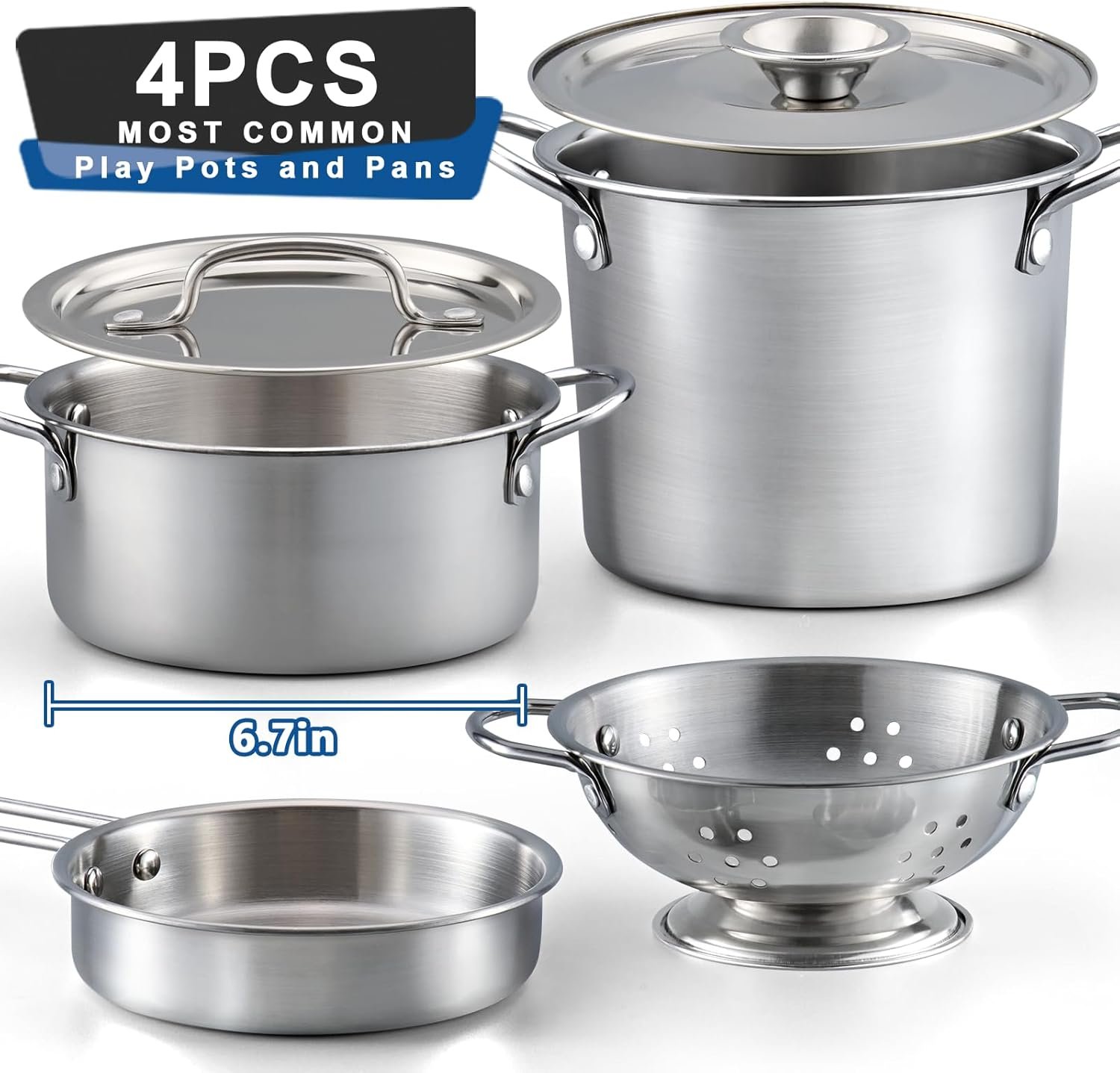 There are 4pcs of pots and pans to cover all life scene, including 7.1inX2.4in Colander, 8.6inX1.2in Fry Pan, 6.7inX2.3in Rondeau Pan and 6.3inX3.4in Stock Pot.