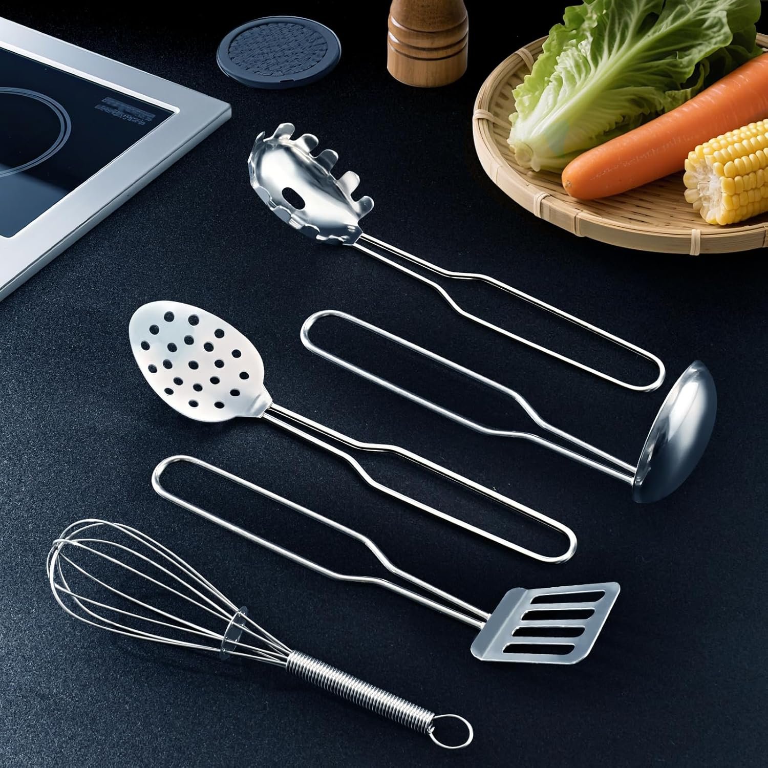 5pcs kitchen utensils are about 6~7in long, containing Spaghetti Server, Slotted Spoon, Whisk, Ladle and Slotted Spatula.