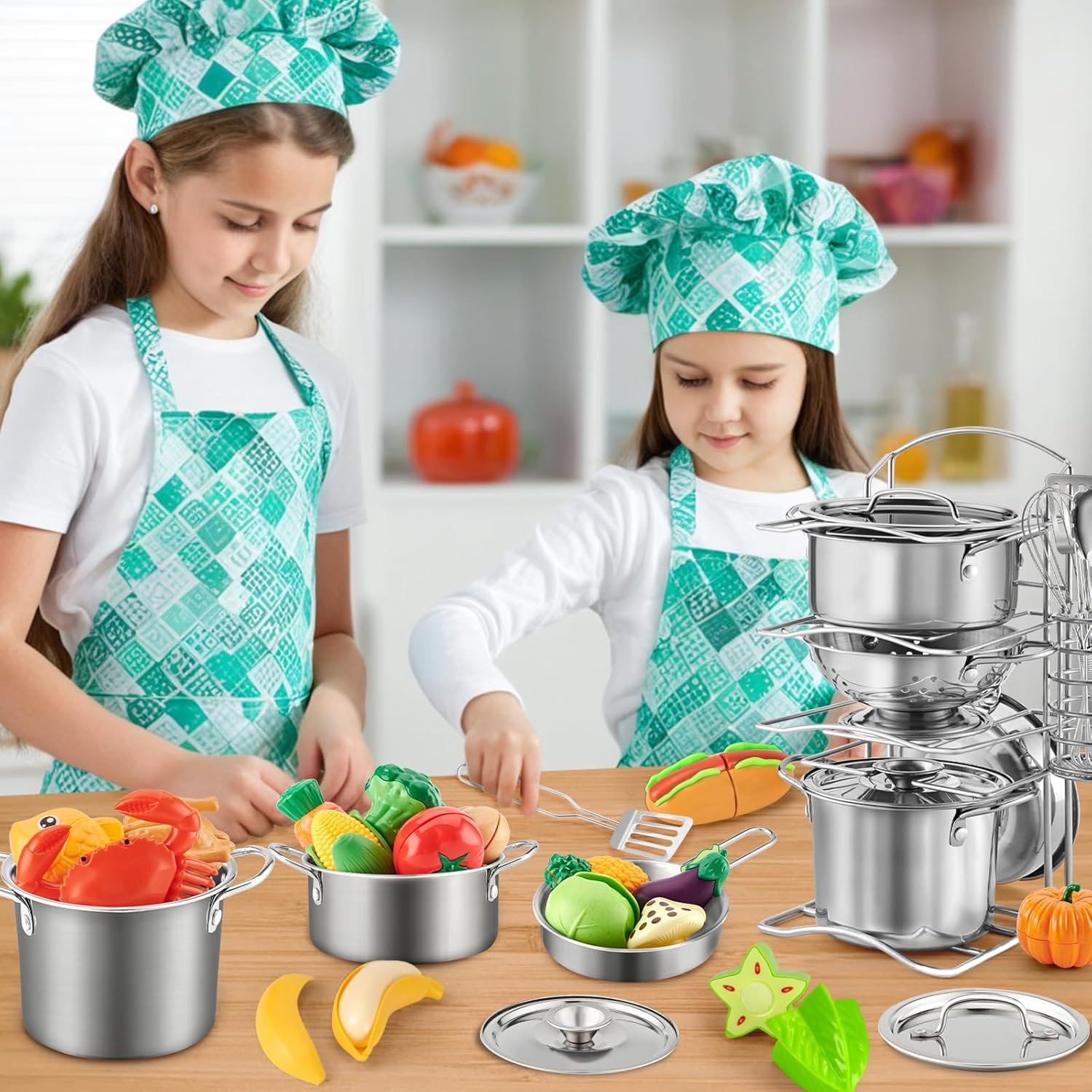 The playset contains 12 Pcs common pots, kitchen utensils and rack, is often played with play kitchen set or food set.