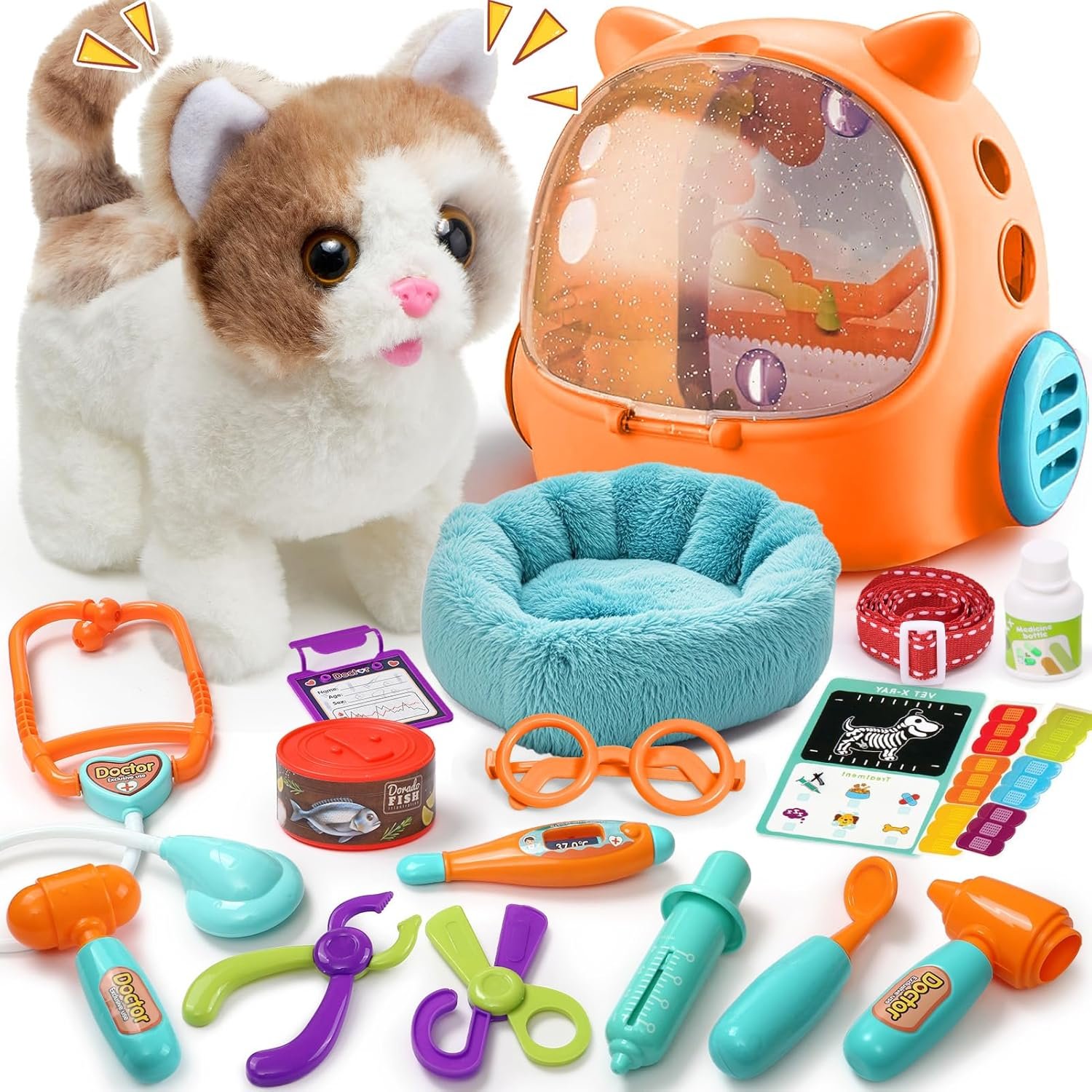 Complete Veterinarian Playset: This veterinarian playset toy set includes lifelike electric plush cat that walks, meows, nods, and wags its tail, a backpack carrier, and 15pcs medical accessories like a stethoscope, thermometer, syringe, medicine bottles, otoscope, hammer, oral mirror, tweezers, scissors, doctor cards, X-ray cards, bandages, glasses, cat food, and a cozy cat bed. This all-in-one playset lets your kids step into the shoes of a caring vet
