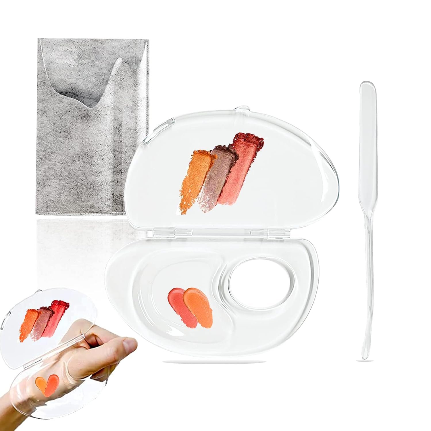 1 x Acrylic Foundation Mixing Palette(4.8 inch*2.5 inch) 1 x Acrylic Makeup Spatula Tool(6.3inch )1 x Felt Bag(6.8 inch*4 inch)