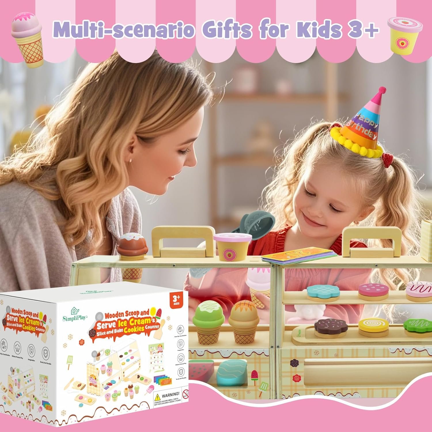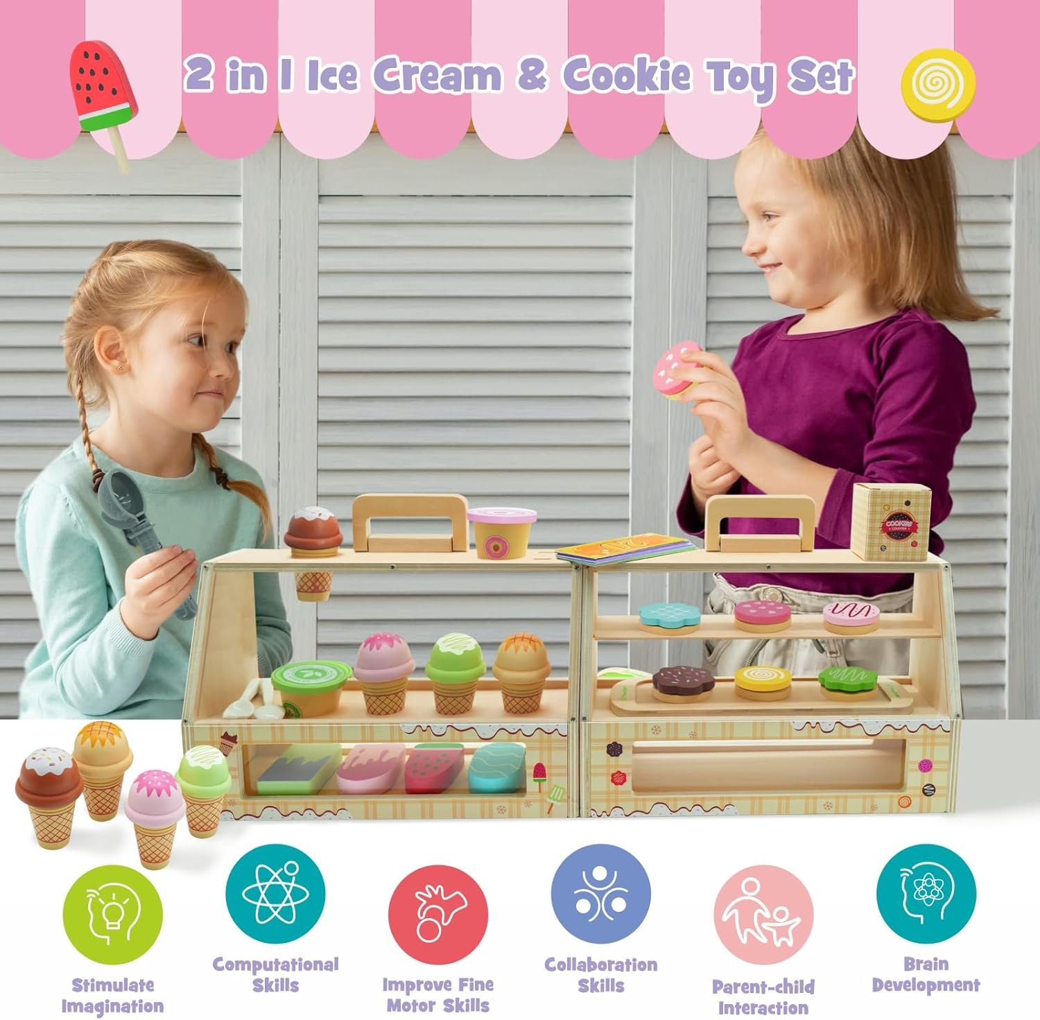 【Portable Lockable 2-In-1 Wooden Toy Set】Pretend play toys include:4*Ice Cream Scoops、4*Ice Cream Cones、2*Ice Cream Cups、2*Ice Cream Blocks、2*Wooden Scoopers、1*Plastic Scooper、6*Cookie Sandwiches、6*Butter Cookies、1*Baking Tray、1*Pallet、1*Wooden Knife、1*Spatula、1*Cookie Box、1* Baking Gloves、1*Ice Cream & Cookies House、4*Popsicles、1*Reusable Menu Card、20*Play Bills、1*Packing Bag。All accessories can be stored in the house for convenient use, storage, and travel