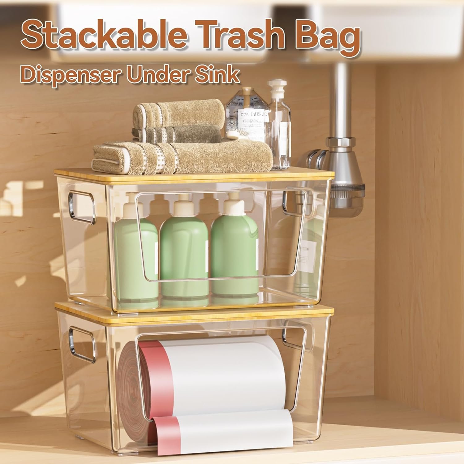 Stackable Design: Our original intention in design is to maximize the use of vertical space. Multiple kitchen laundry storage bins can be stacked together for use, and the top bamboo cover design not only looks beautiful but also provides additional storage space. The garbage bag holder makes the trash bags easy to store, keeping your kitchen or cabinet space clean and tidy while saving space