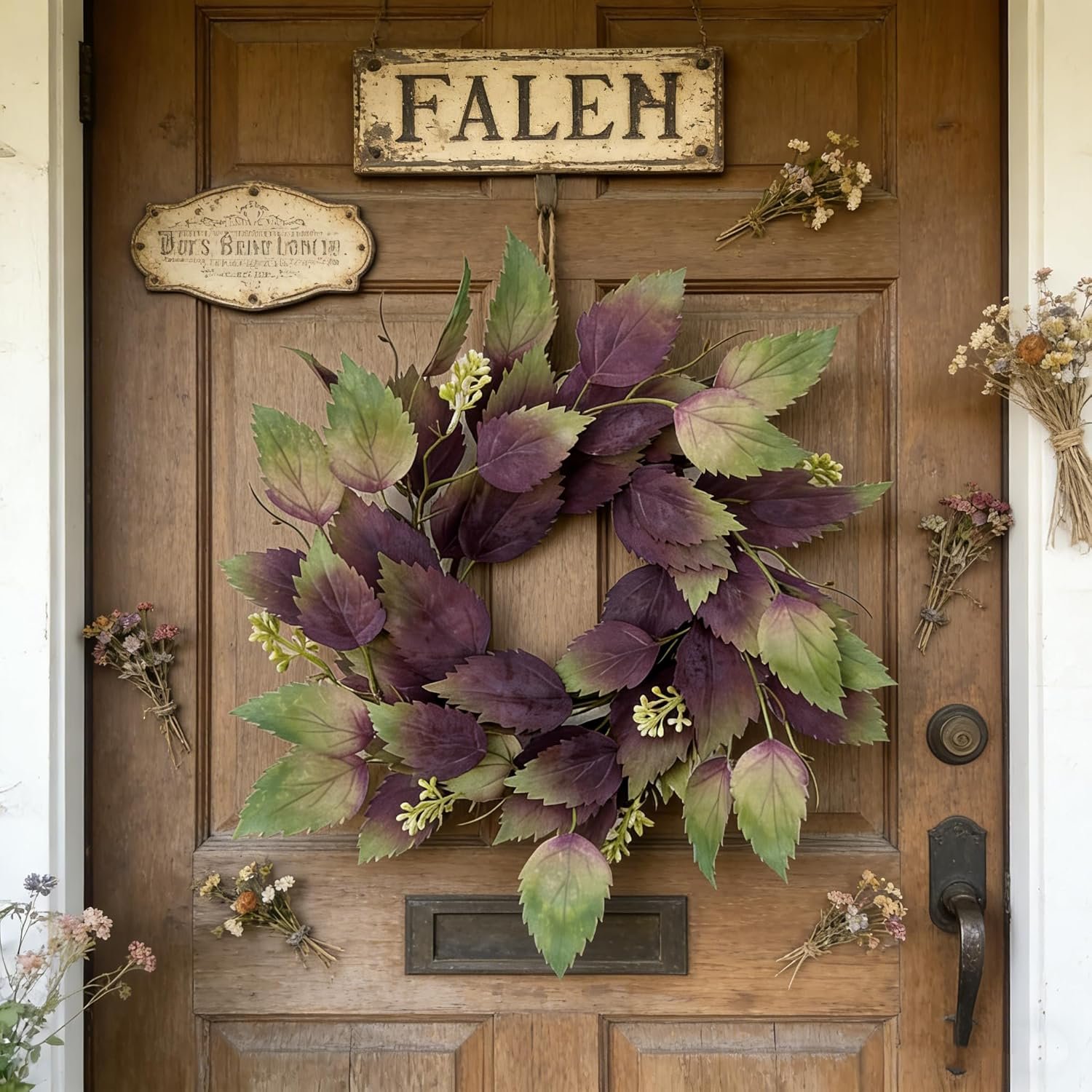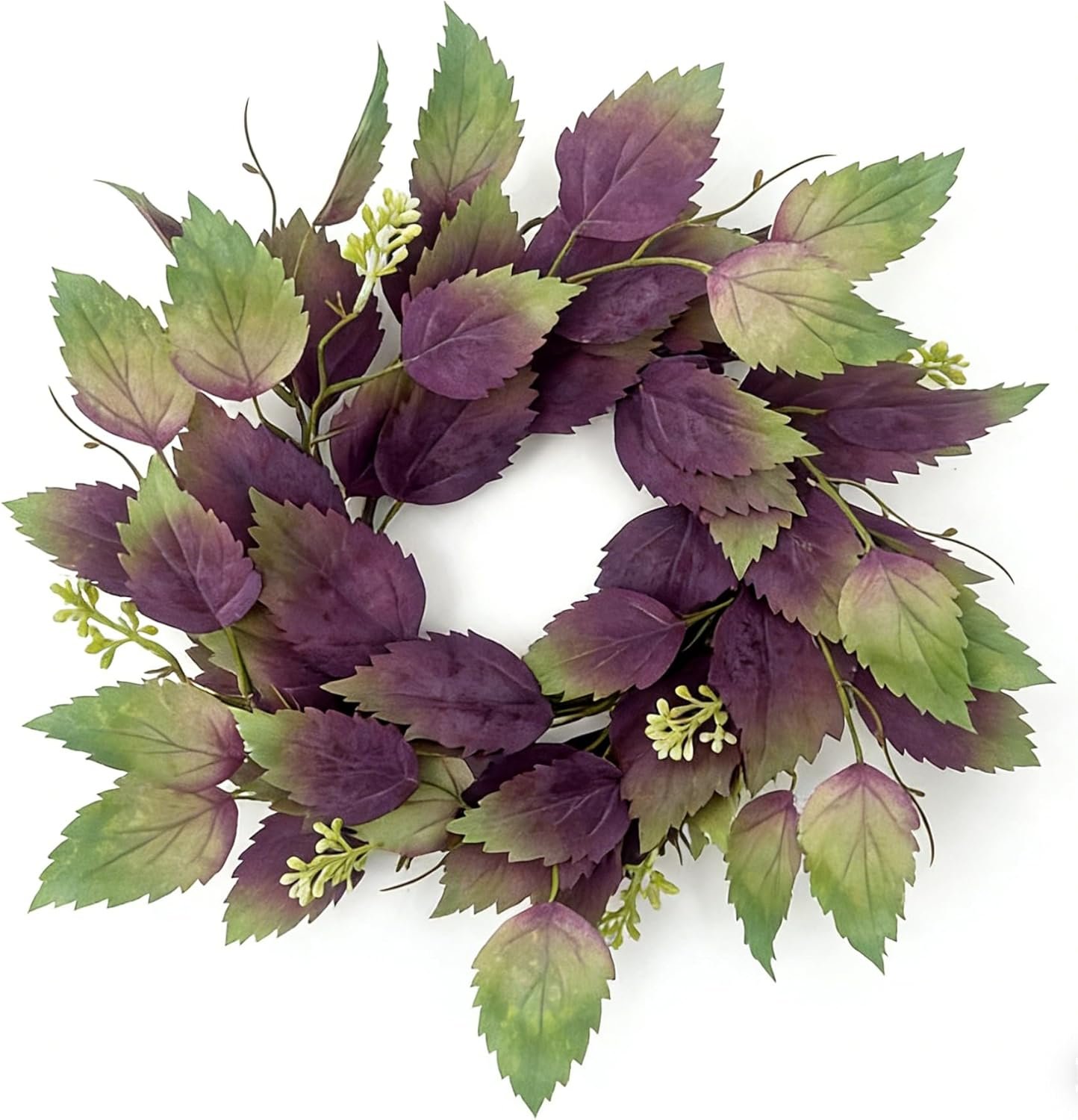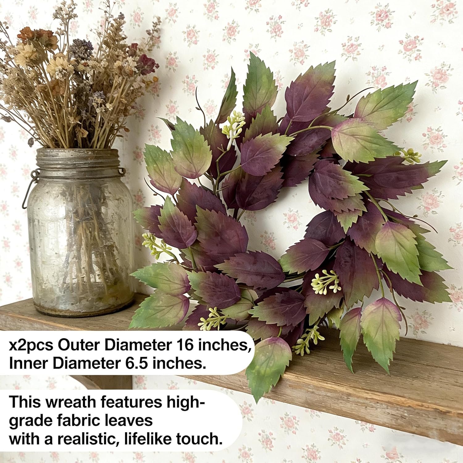Vibrant 2-Pack Purple Hibiscus Wreath Set: Includes 2 pieces of 16-inch wreaths. Each wreath features lush purple hibiscus leaves paired with classic eucalyptus and beautiful maple leaves, accented with delicate hibiscus buds and tiny green berries. The rich purple hue and natural texture of the triple foliage create a vivid, eye-catching appearance that doubles the decorative effect for your space.