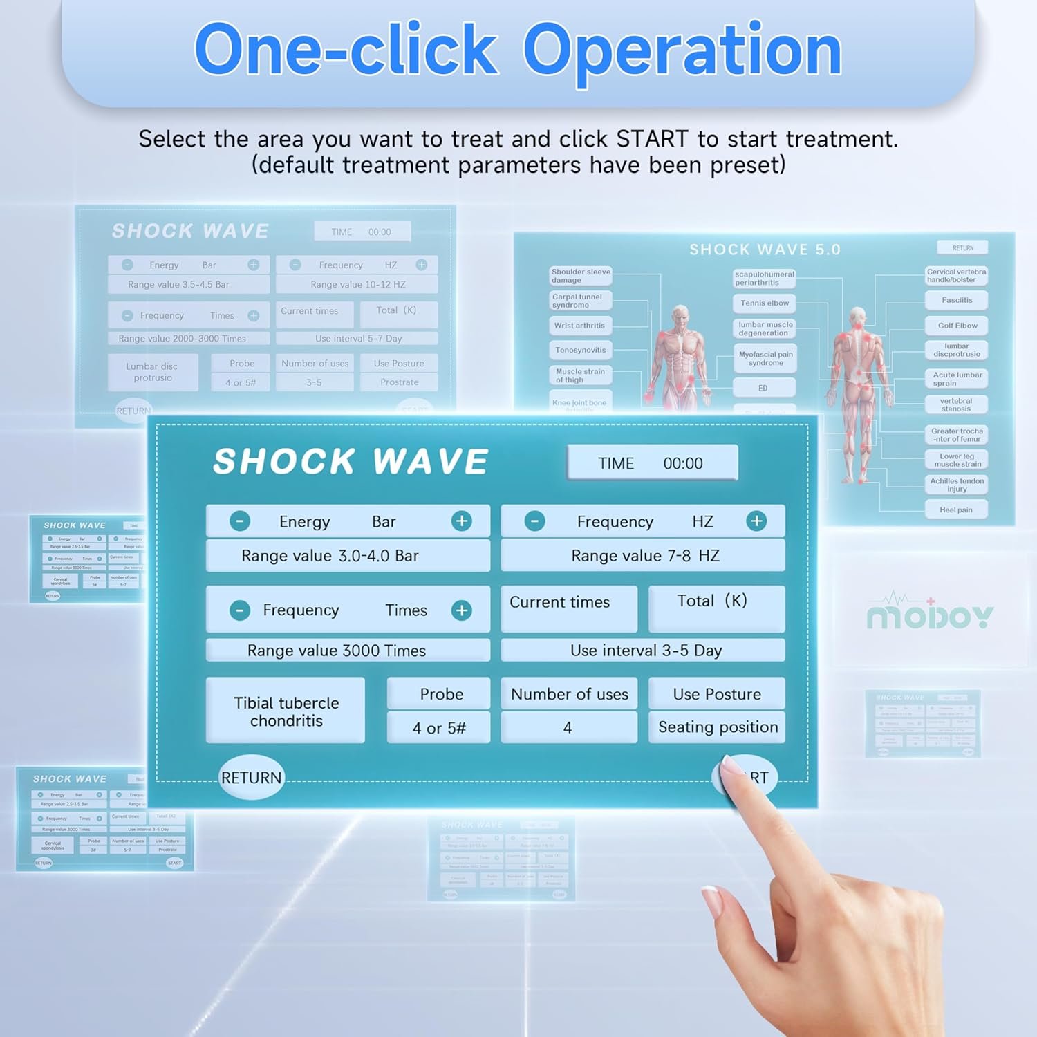 𝗘𝗮𝘀𝘆 𝘁𝗼 𝗨𝘀𝗲: Features a 10.1-inch touchscreen with a clean graphical interface and one-touch start. Includes 7 interchangeable shockwave therapy heads for feet, small joints, large muscle areas, and both superficial and deep applications. From beginners to professionals, can operate it effortlessly.