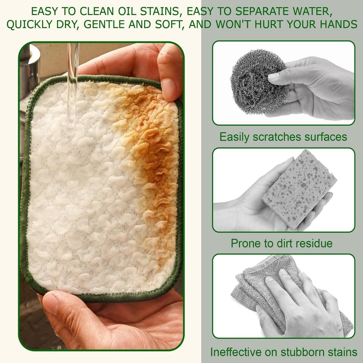 Enhanced Absorbency Design: Ultra-absorbent cotton side quickly wicks moisture for efficient drying and wiping, while the space-saving design allows for easy wall-hanging storage and quick drainage after use. The fine-hole design of our dishwashing rags enhances their foaming capability. Wet them to efficiently clean tableware, pots, and other kitchen items