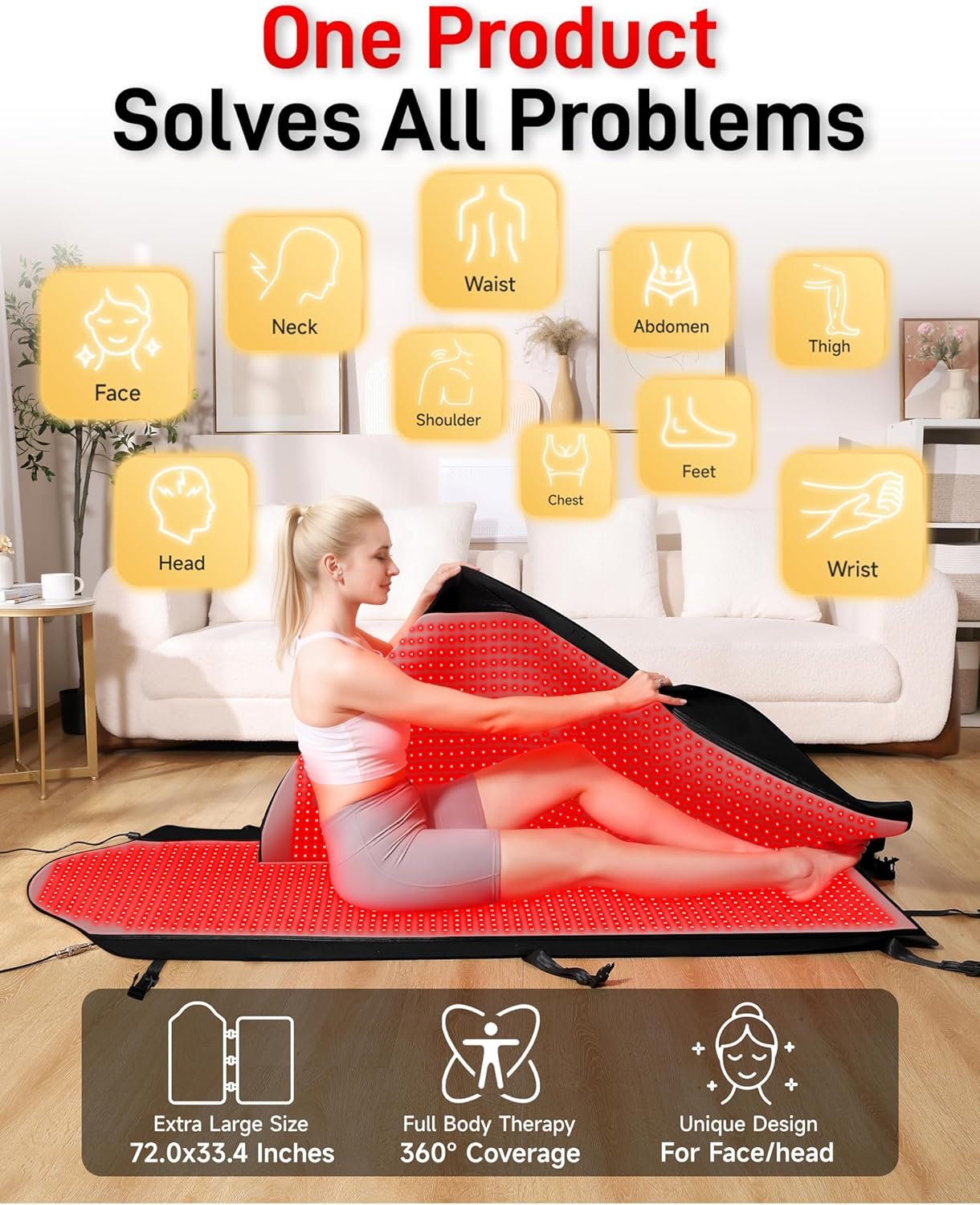 𝐂𝐨𝐦𝐩𝐫𝐞𝐡𝐞𝐧𝐬𝐢𝐯𝐞 𝐖𝐡𝐨𝐥𝐞-𝐁𝐨𝐝𝐲 𝐑𝐋𝐓 𝐄𝐱𝐩𝐞𝐫𝐢𝐞𝐧𝐜𝐞: Measuring 72.0″ x 33.4″ , our Full Body Red Light Therapy Mat offers extra-large coverage for a 360° red light therapy experience. The unique head area provides individual head or face red light therapy for seamless full body red light therapy