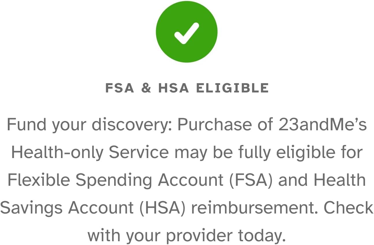 Before mailing, register your genetic test kit at 23andMe online otherwise your sample will NOT be processed. 23andMe Health-only Service is FSA & HSA eligible. Fund your discovery. Not all DNA tests, at-home testing kits, or ancestry testing kits are reimbursable. 23andMe’s Health Service may be fully eligible for Flexible Spending Account (FSA) and Health Savings Account (HSA) reimbursement.*** Check with your plan provider today.