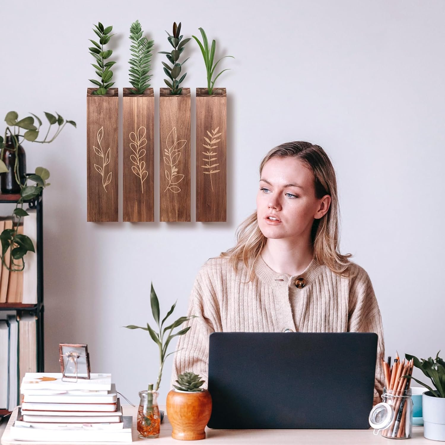 PERFECT DECORATIVE SIZE – Each plant wall shelf measures 11.8 inches high x 2.8 inches wide and 1.6 inches thick. Made by hand so each piece is slightly different and each one is unique. (Note: Note: The package does not include the fake flowers shown in the picture, it only includes 4 wooden vases)