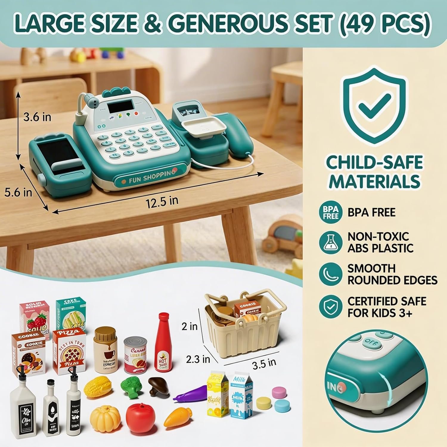 [DELUXE 49-PIECE GROCERY SET] Comes with everything needed to open for business immediately. Includes 1 functional register, 1 shopping basket, 22 lifelike grocery items (vegetables, snacks, drinks, seasonings and more), and a 25-piece money set (coins, cash, credit card). The large variety of accessories encourages creative organization and prolonged play sessions.
