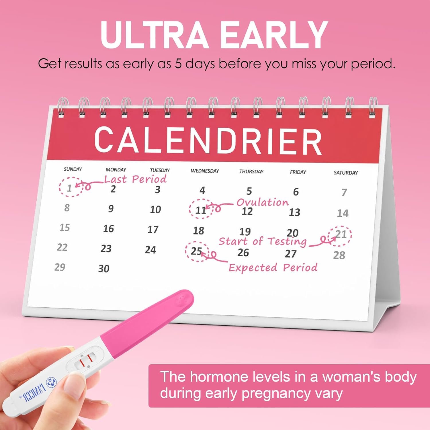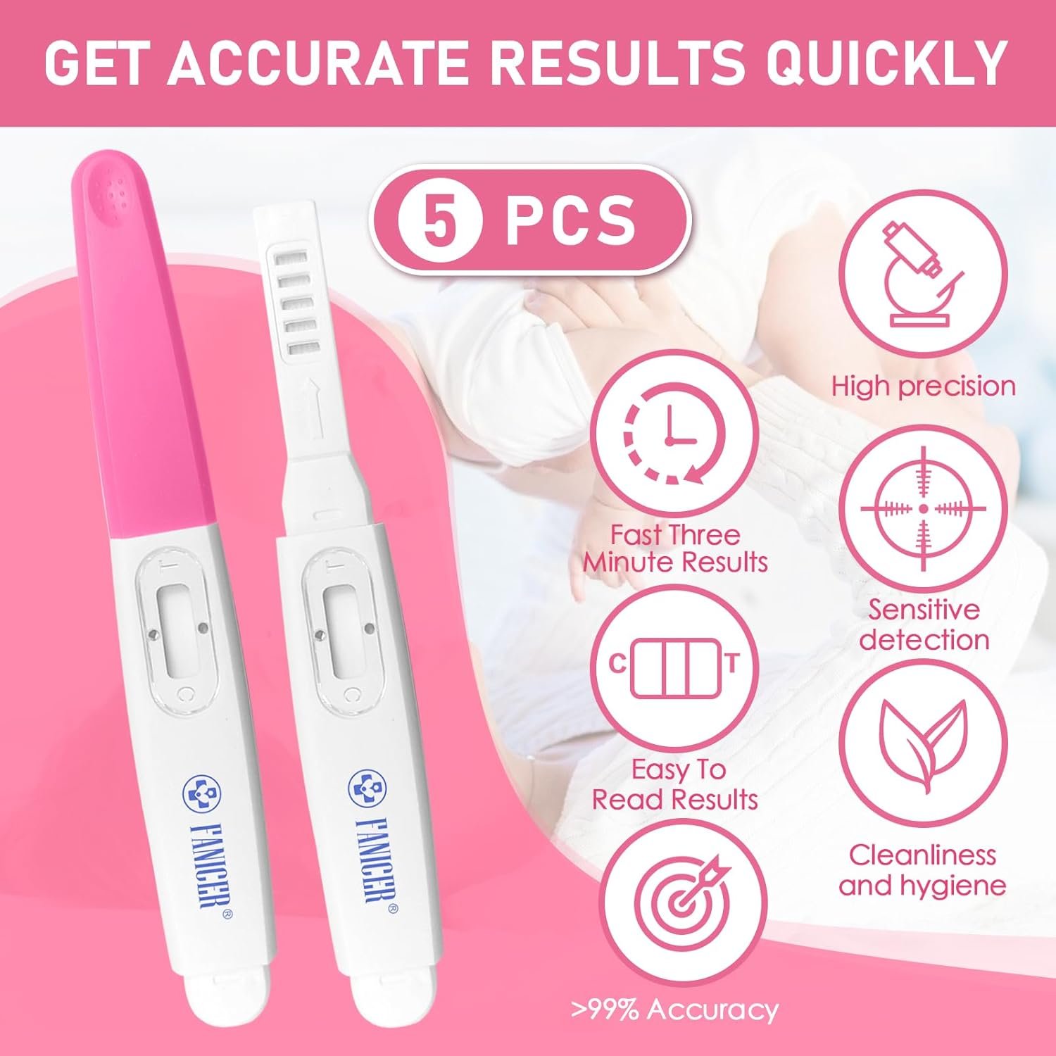 Each package contains 5 early pregnancy test strips, which can be used to detect 5 different urine samples, providing you with clear test results,it and can be carried around or operated at home.