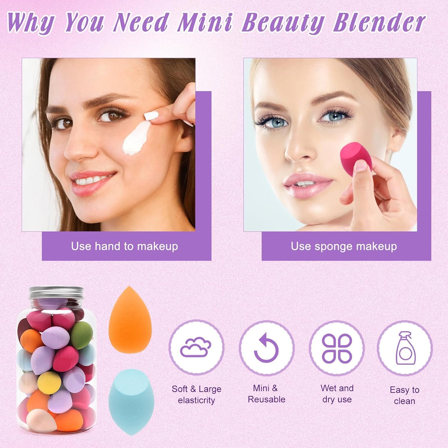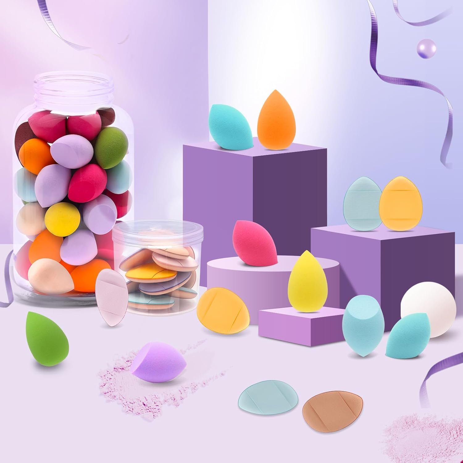 【Mini Beauty Blender Set】You will get 40PCS random color mini beauty sponges( 2 styles), and 10 PCS finger powder puffs, with plastic storage bottles, easy to store and carry to meet your daily use and replacement needs.