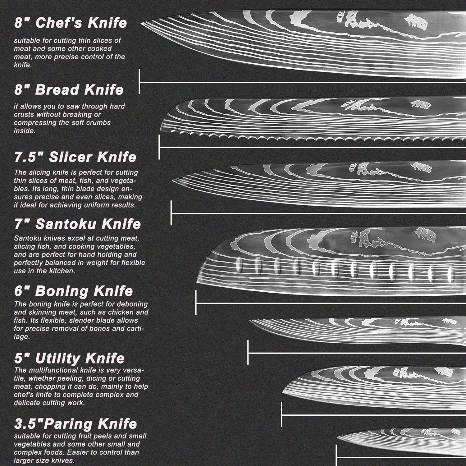 COMPLETE KITCHEN KNIFE SET FOR ALL YOUR NEEDS: This chef knife set includes 7 essential knives: 3.5-inch paring knife, 5-inch utility knife, 6-inch boning knife, 7-inch Santoku knife, 7.5-inch slicer knife, 8-inch bread knife, and 8-inch chef’s knife. Perfect for cutting, peeling, slicing, and dicing fruits, vegetables, and meat. Ideal for both novice cooks and professional chefs looking for a versatile knife block set.