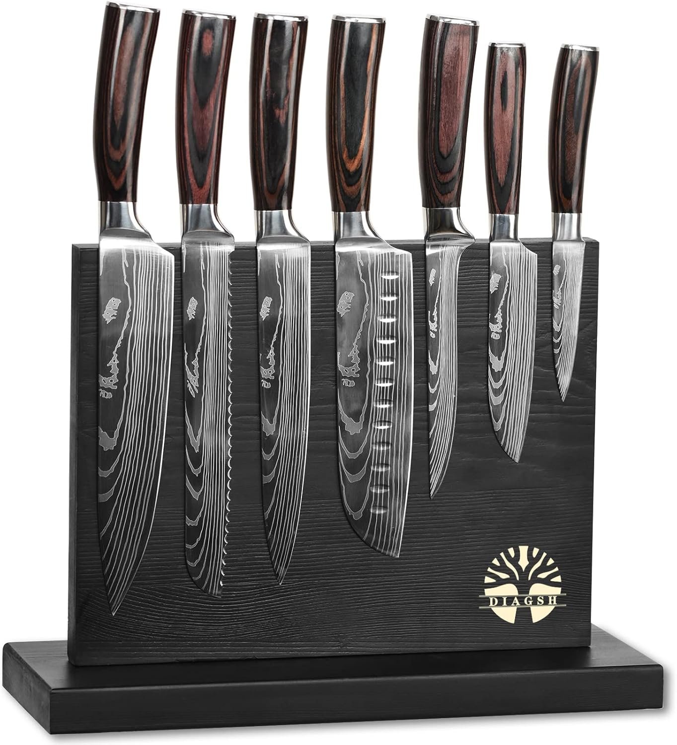 MAGNETIC KNIFE BLOCK FOR SAFE AND ORGANIZED STORAGE: The magnetic knife holder securely holds all your kitchen knives with strong, permanent magnets on both sides, preventing clutter and accidental cuts. This innovative design not only keeps your knives organized but also preserves their sharpness over time. The knife set with block ensures a safer and more efficient kitchen environment.