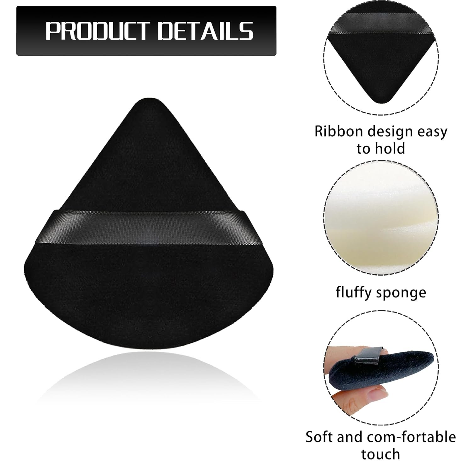 Smooth soft satin ribbon design, easy to useTriangular design can be used for makeup close to the eyesEasy to take powder, no more waste your powderMade of high quality plush and sponge materialSoft and Durable, Washable, ReusedSuitable for dry and wet cosmeticThe set includes 4 cute case for daily storage and keep the powder puff away from dust.easy to carry around