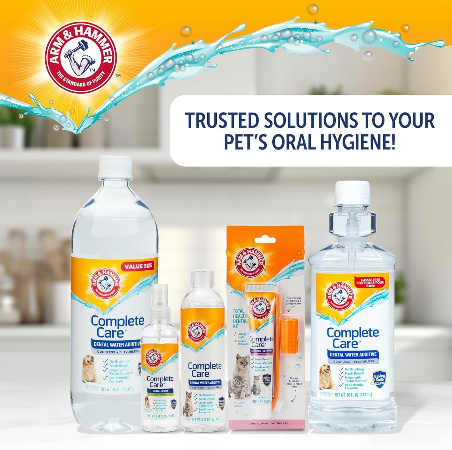 Arm & Hammer Complete Care Dental Spray for Dogs is a premium solution for maintaining your pet’s oral hygiene with ease and efficiency. As a leader in dog dental care, this product is formulated to cater specifically to the oral health needs of your canine companion. Our dog dental spray is designed to be a simple yet effective way to ensure fresh breath for dogs, while promoting overall dental health without the hassle of brushing. This mint dog breath freshener is an innovation in dental care, allowing you to effortlessly integrate oral care into your dog’s daily routine. Each 6oz bottle contains a pet-friendly formula enhanced with the power of Arm & Hammer baking soda to naturally clean and deodorize your dog’s mouth. In addition to baking soda, our formula is fortified with added calcium, a crucial element in the make up of healthy teeth. Our Arm & Hammer Complete Care Dental Spray is a testament to our commitment to pet care, offering a no-brushing solution that seamlessly fits into your lifestyle. This dog spray not only aids in maintaining fresh breath for dogs but also contributes to overall oral health, making it an essential addition to your dog’s daily regimen. Choose Arm & Hammer Complete Care Dental Spray for a simple, effective, and trusted solution to your dog’s oral hygiene needs. DIRECTIONS: Lift lips on either side of your dog’s mouth. Spray 1-2 pumps directly onto teeth and gums per side. For best results, do not let dog eat or drink for one hour after use.