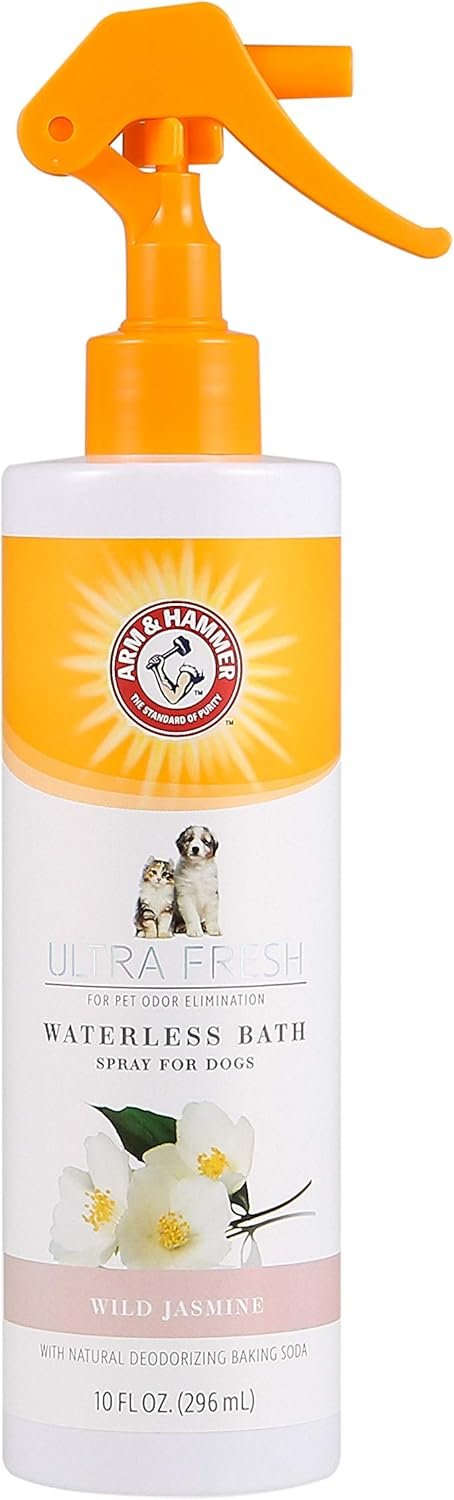 Freshen up your pet to the next level with Arm & Hammer Ultra Fresh grooming. Our Waterless Bath Spray in Fresh Jasmine instantly cleanses and helps balance moisture for a radiant shine in between baths. Made with cucumber and white tea and infused with baking soda, this dog spray neutralizes bad odors and removes impurities for an advanced clean. This no-rinse formula makes clean ups quick and easy with a revitalizing fresh jasmine fragrance leaving your pet Ultra Fresh every time. Keep your dog clean and fresh with this waterless dog wash that works naturally. This gentle dog spray is infused with the signature Arm & Hammer baking soda, great for combatting dog odors. It naturally takes care of pet odors, keeping your pup smelling fresh all day (scent may vary, depending on availability). The Arm & Hammer Ultra Fresh Waterless Deodorizing Dry Dog Shampoo comes in a convenient spray pump bottle. Use in conjunction with our other Ultra Fresh products to help lock in the delicious scent! DIRECTIONS: Spray dog from back of ears to tail, carefully avoiding eyes. Massage into coat. Repeat as necessary. Can be used on wet or dry fur. For external use only. INGREDIENTS: Water, Coconut Based Surfactants, EDTA Disodium Salt, Alkyl Polyglucoside, Glycerin, Glyceryl Cocoate, Hydrolyzed Wheat Protein, White Tea Extract, Butylene Glycol, Cucumber Extract, Fragrance, DMDM Hydantoin. WARNINGS: For external use only. Safe for dogs 8 weeks of age and older. Avoid contact with eyes. Keep out of reach of children.