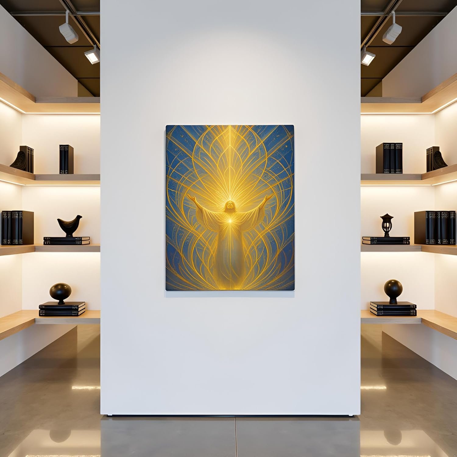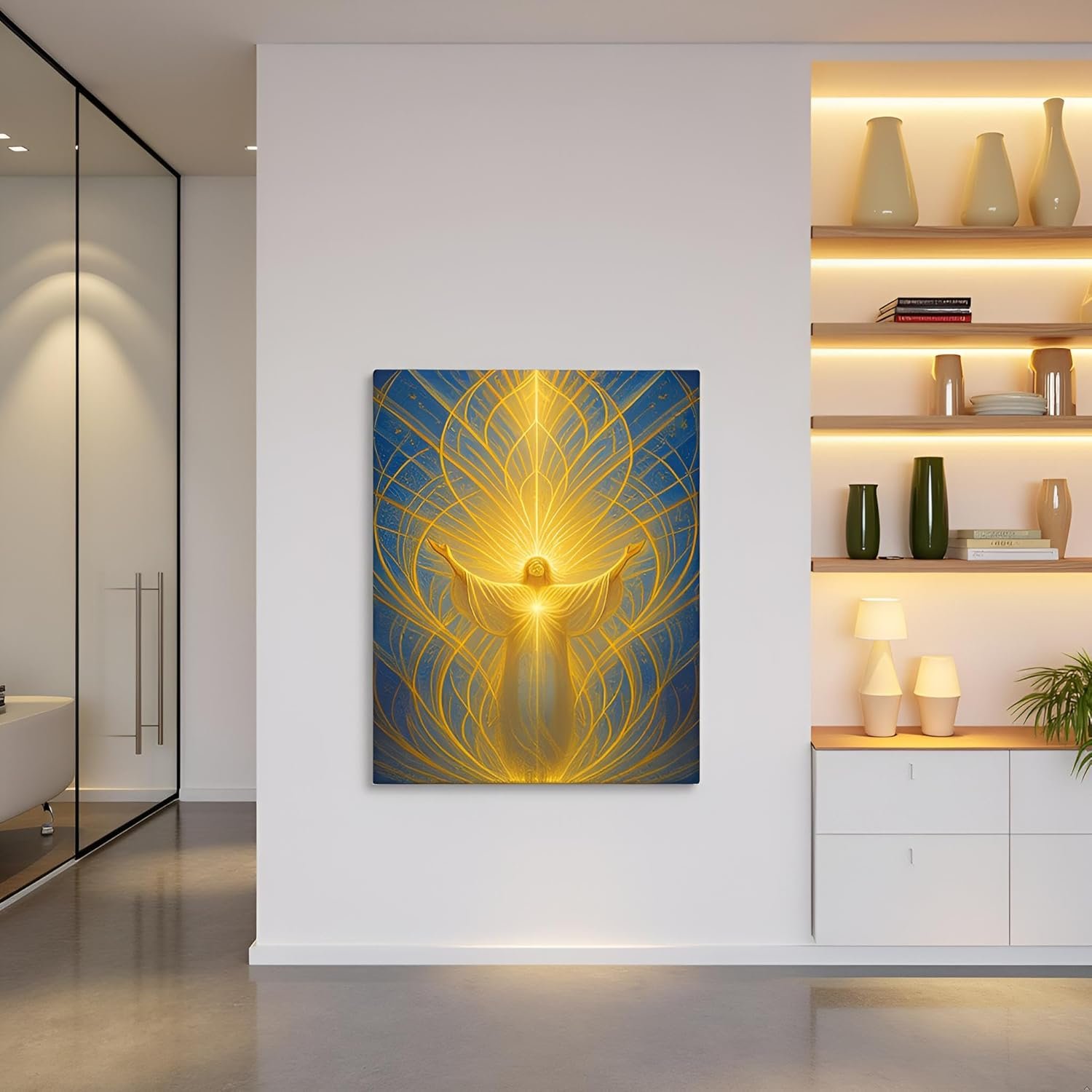 Rebirth of Light was designed to shift the atmosphere of any room the moment it goes up on a wall. The imagery carries a powerful message: clarity rises when you do. The figure in the center stands open, grounded, and fully present, surrounded by radiant layers of gold that symbolize inner renewal. Every detail in this piece is built to communicate upward movement — a return to awareness, direction, and strength.