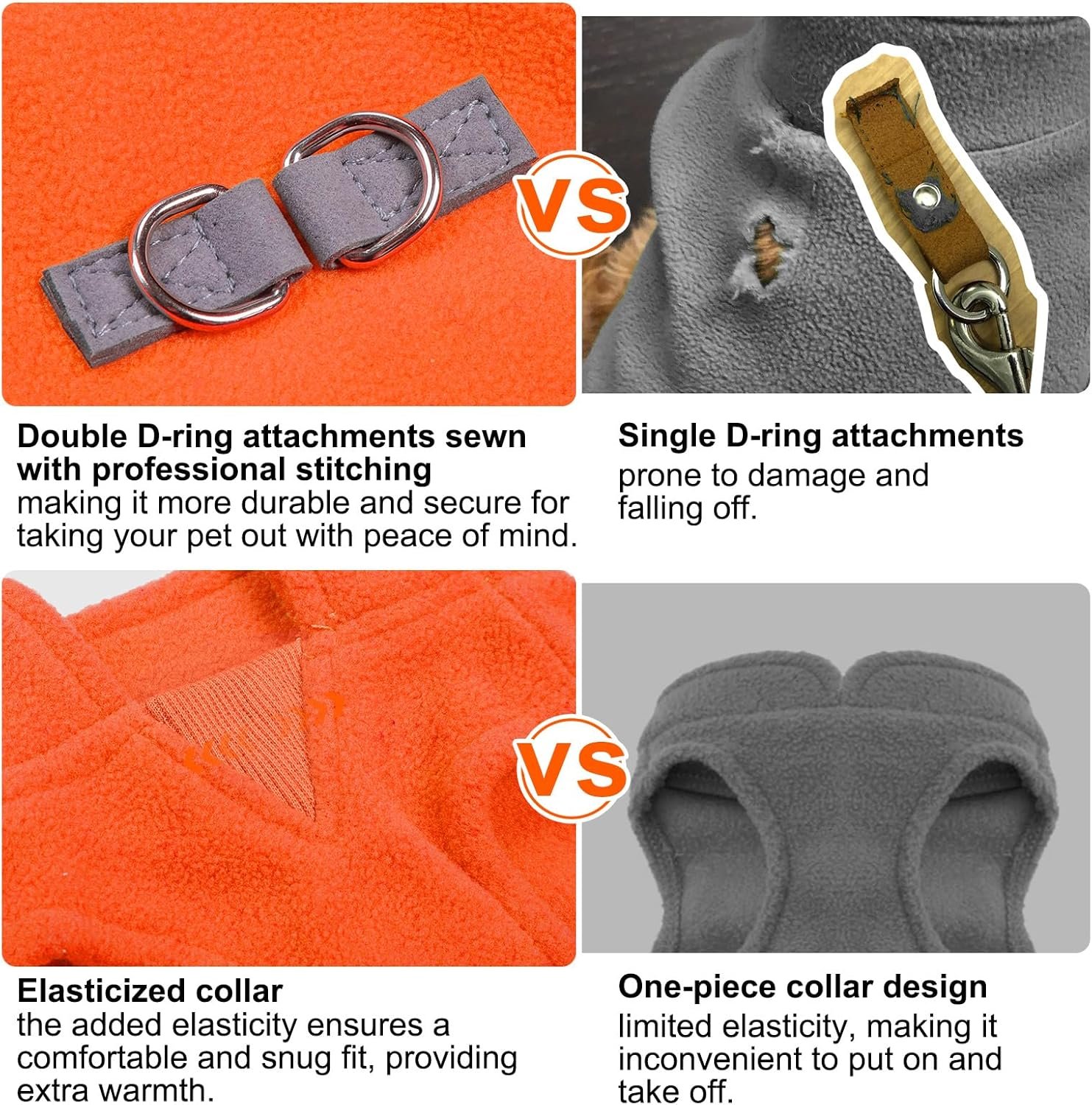 [Double D-rings For Leash] The dog clothes for small dogs are equipped with two D-rings on the back for walks. Easy to connect the leash, with two sturdy leather pieces sewn into the dog sweatshirt, making the pet clothes tougher than a single O-ring fleece coat. Just pair the dog clothing with a leash, and your furry friends are ready for a walk