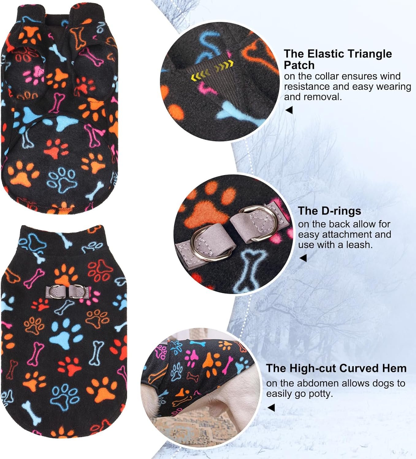 [Double D-rings For Leash] The dog clothes for small dogs are equipped with two D-rings on the back for walks. Easy to connect the leash, with two sturdy leather pieces sewn into the dog sweatshirt, making the pet clothes tougher than a single O-ring fleece coat. Just pair the dog clothing with a leash, and your furry friends are ready for a walk