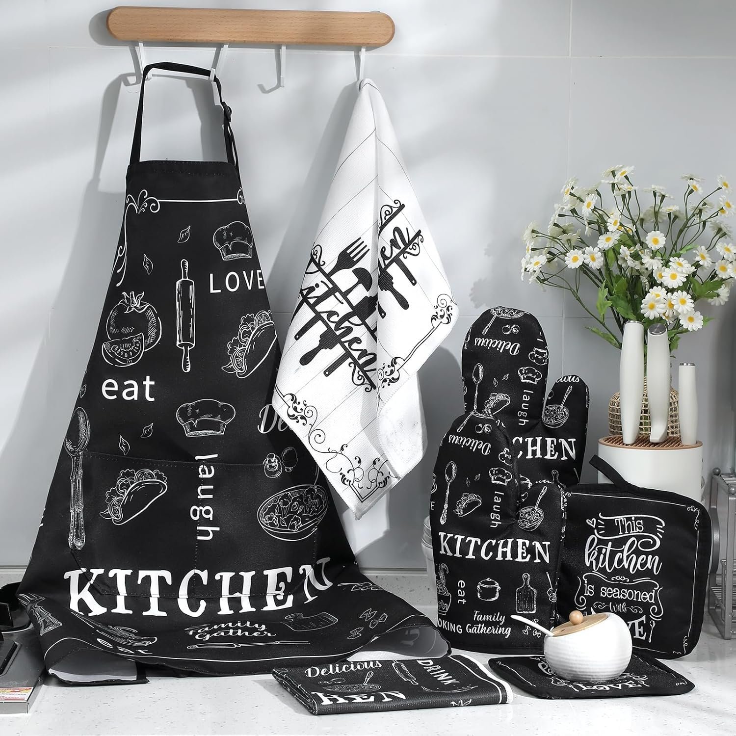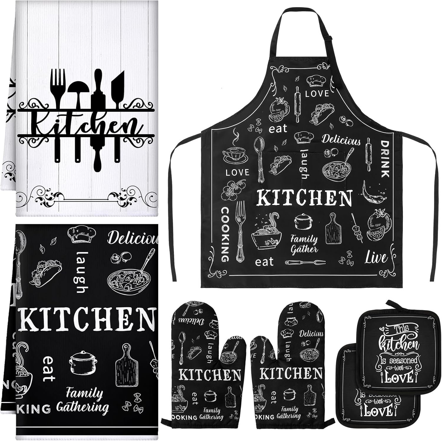 Bencailor 7 Pcs Kitchen Towels Oven Mitt and Pot Holder Apron Kitchen Decor Birthday Party Gifts (Cooking Meal Theme)