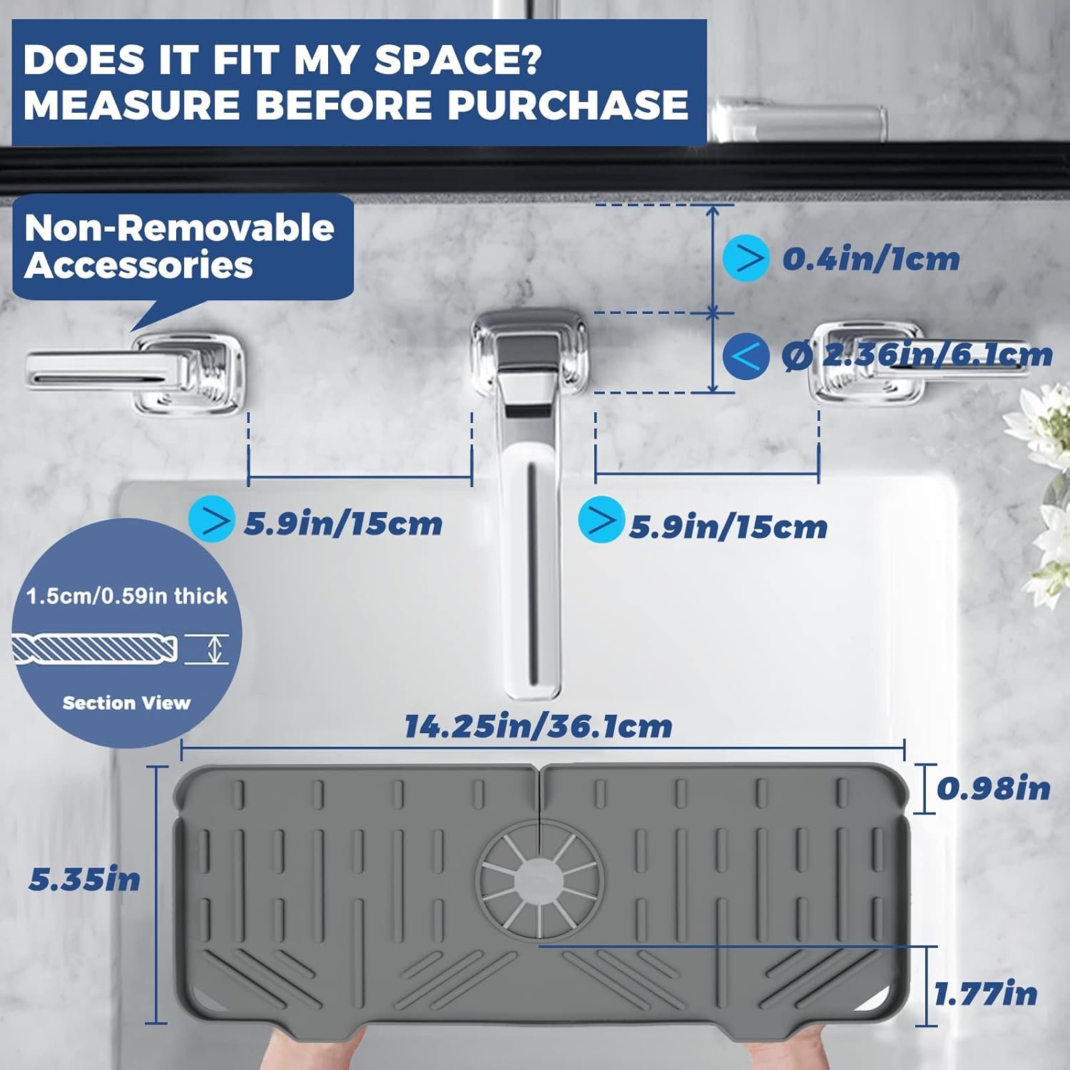 That there must be no obstructions within a length of at least 6 inches on the left and right sides of the faucet. Otherwise there is not enough space to put silicone faucet handle drip catcher tray