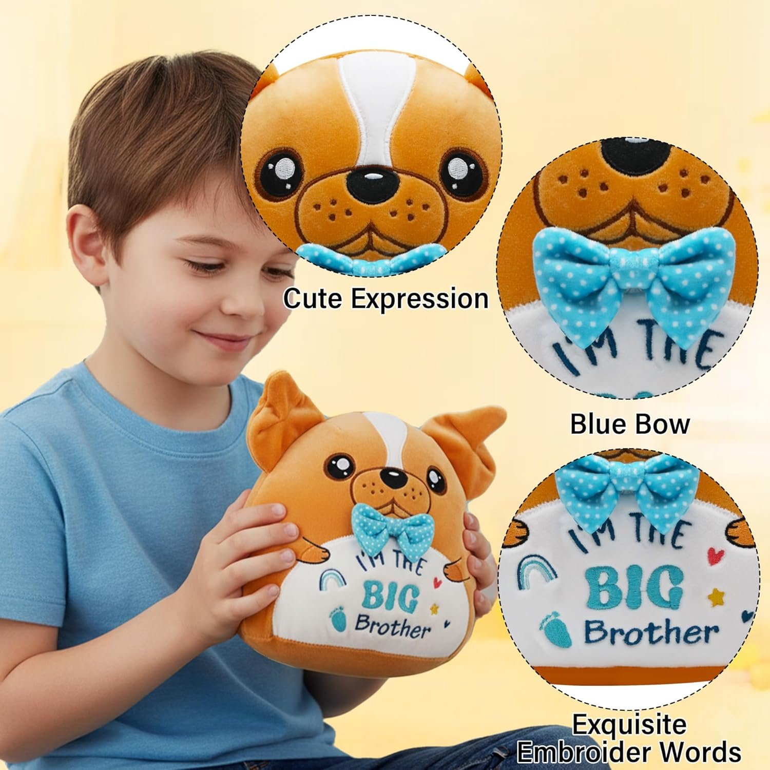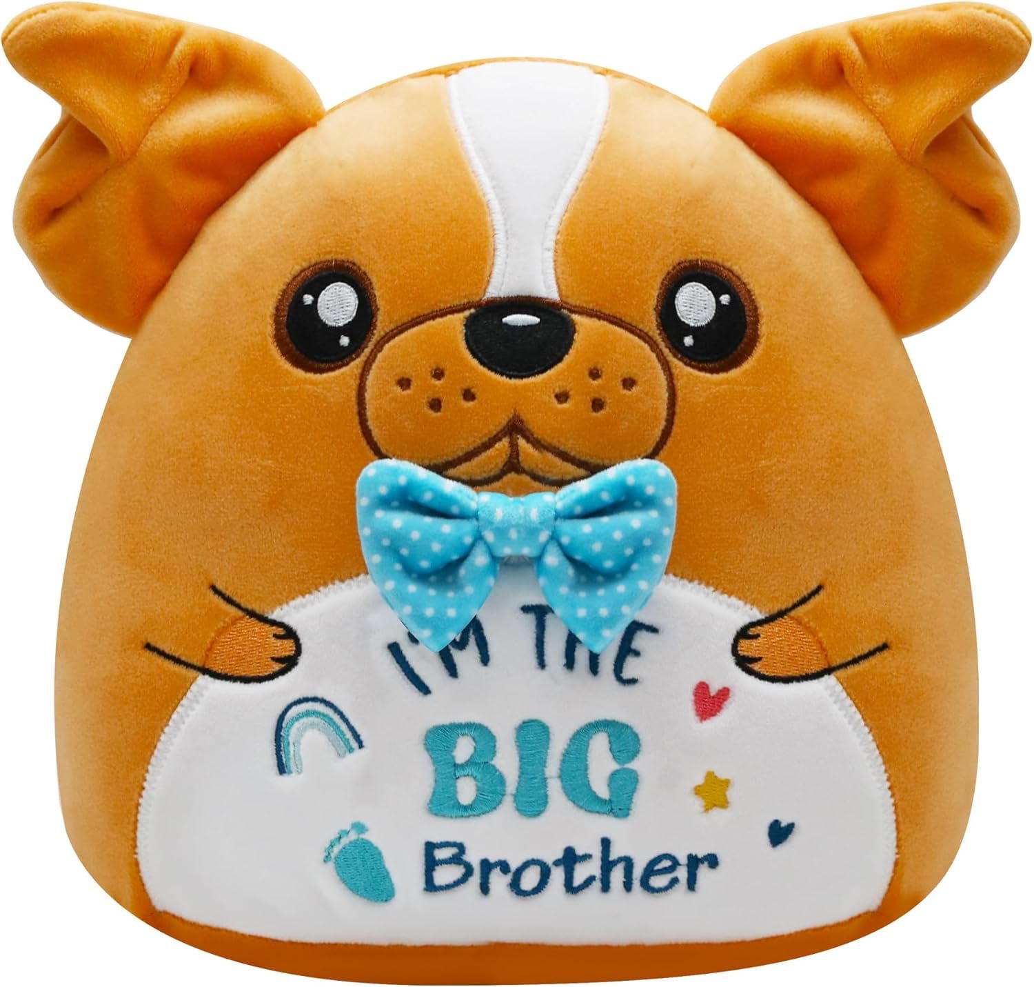 Cute Bulldog Plush: This NIUBEHOHO bulldog plush with “I’m the Big Brother” belly embroidery and blue bow tie, it’ s a great gift for soon-to-be big brothers. The bulldog plush gently teaches responsibility – reminds big brother to care for younger
