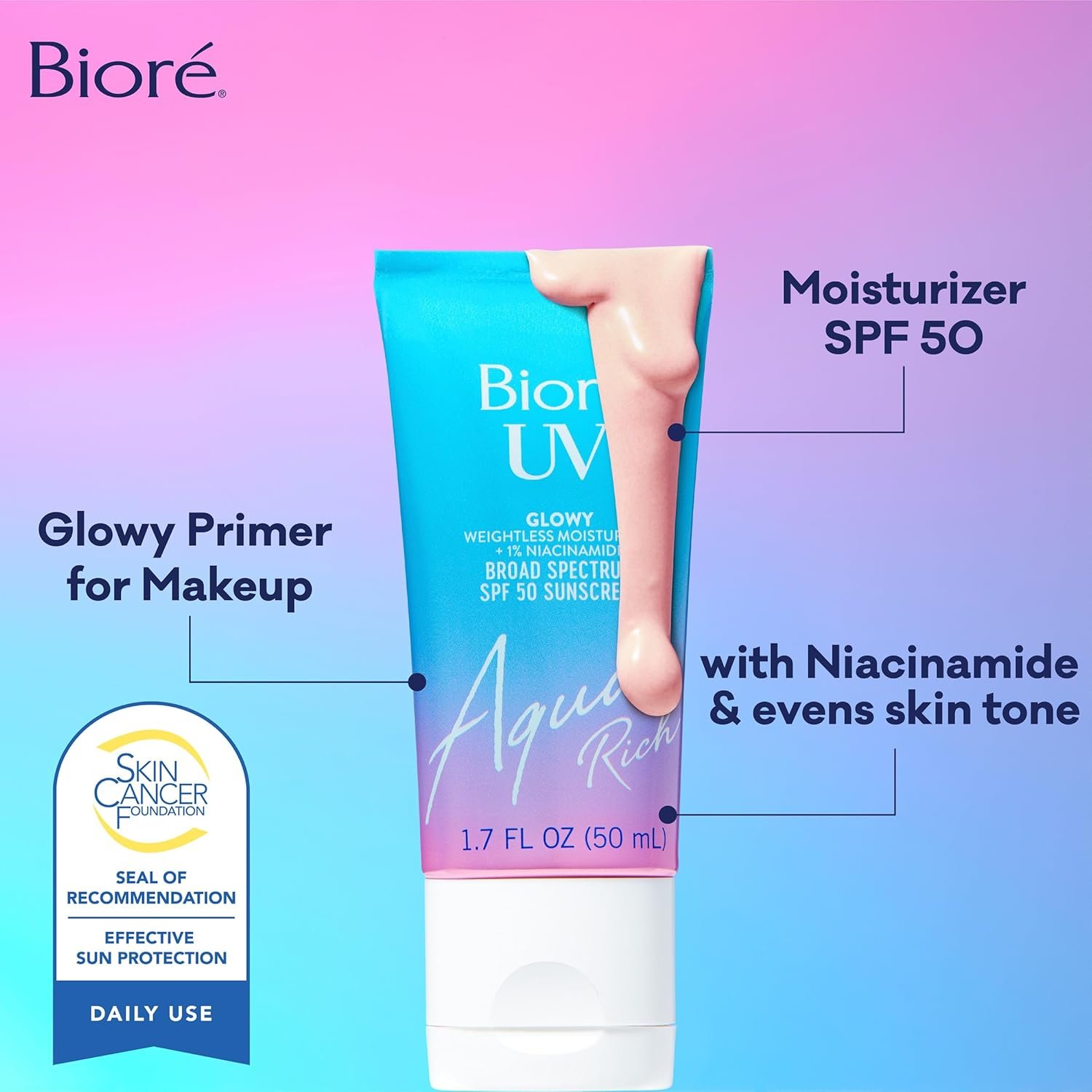 Experience glow beauty with Bioré UV Aqua Rich Glow Enhancing Moisturizer! This lightweight moisturizer with SPF 50 delivers instant hydration and a sheer, glowy finish. Infused with 1% Niacinamide, this daily face moisturizer with SPF not only gives you an immediate radiant boost but also promotes a more even skin tone and texture over time. Consumers who tried it agreed that their skin looked 2 times brighter and more moisturized after just one use! Inspired by Japanese skincare, Bioré UV Aqua Rich Glow Enhancing Moisturizer is a specially formulated gel encapsulation of UV actives that give you a glow while offering protection. This facial sunscreen is so lightweight that you can even apply it under your makeup as a primer! Plus, the broad spectrum UVA/UVB protection makes it easy to layer protection seamlessly into your daily skincare routine. Biore UV Aqua Rich Glow Enhancing Moisturizer is non-greasy, gentle on sensitive skin, and non-comedogenic, so you won’t have to worry about it clogging your pores. Because it’s formulated as one universal shade, it also blends instantly and seamlessly across all skin tones. Try this instant glow beauty boost to reveal radiant, lit-from-within skin with only one use, while proactively protecting your pores from the sun, so you can love your skin for many, many years. Satisfaction Guaranteed. Limitations may apply.