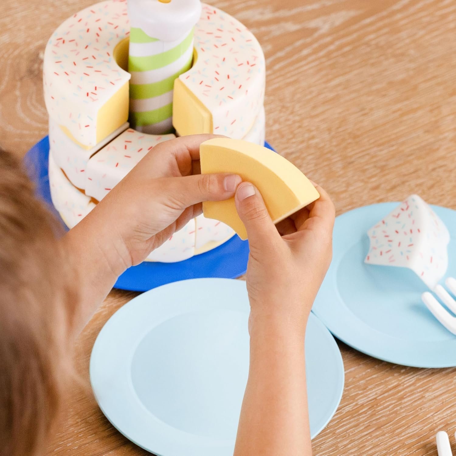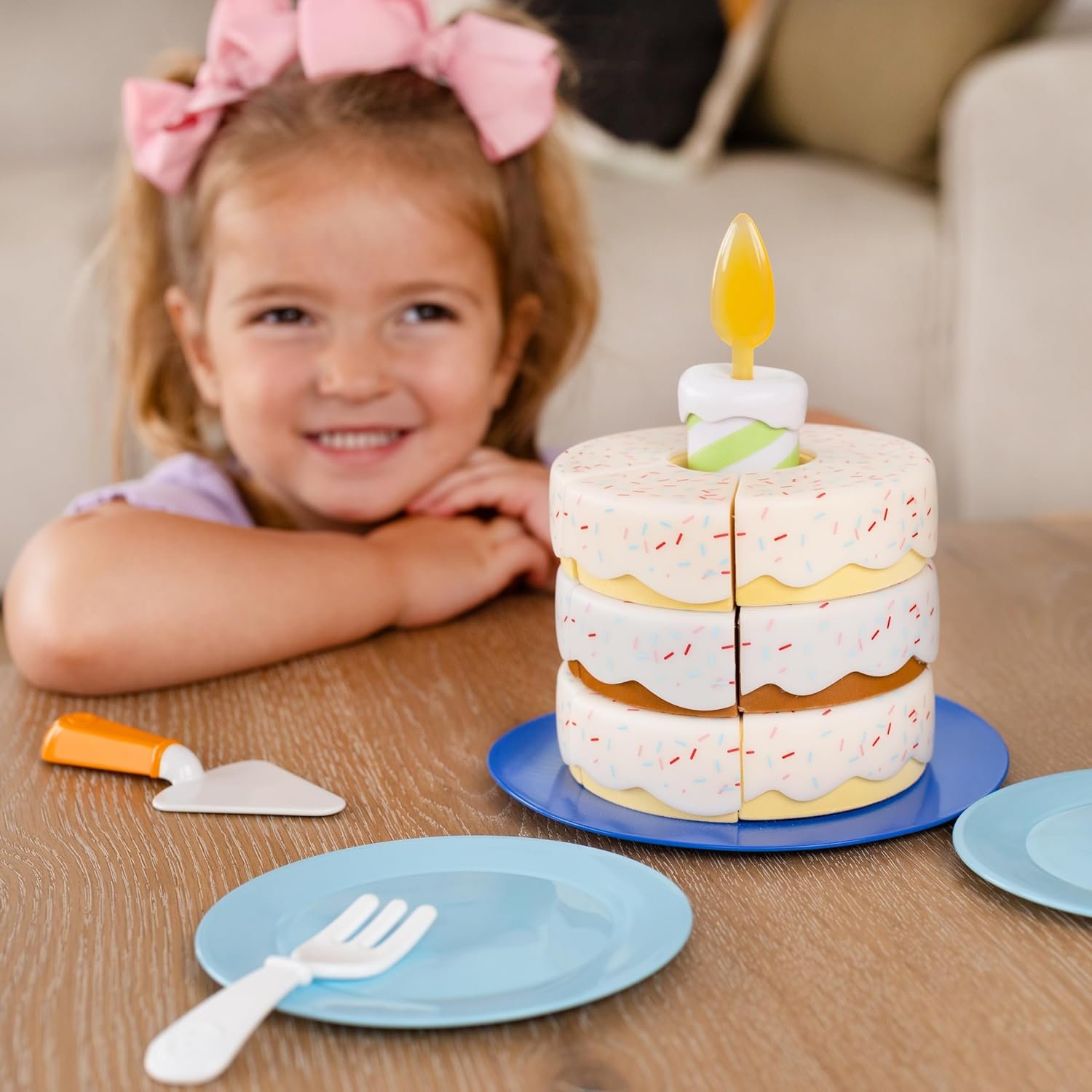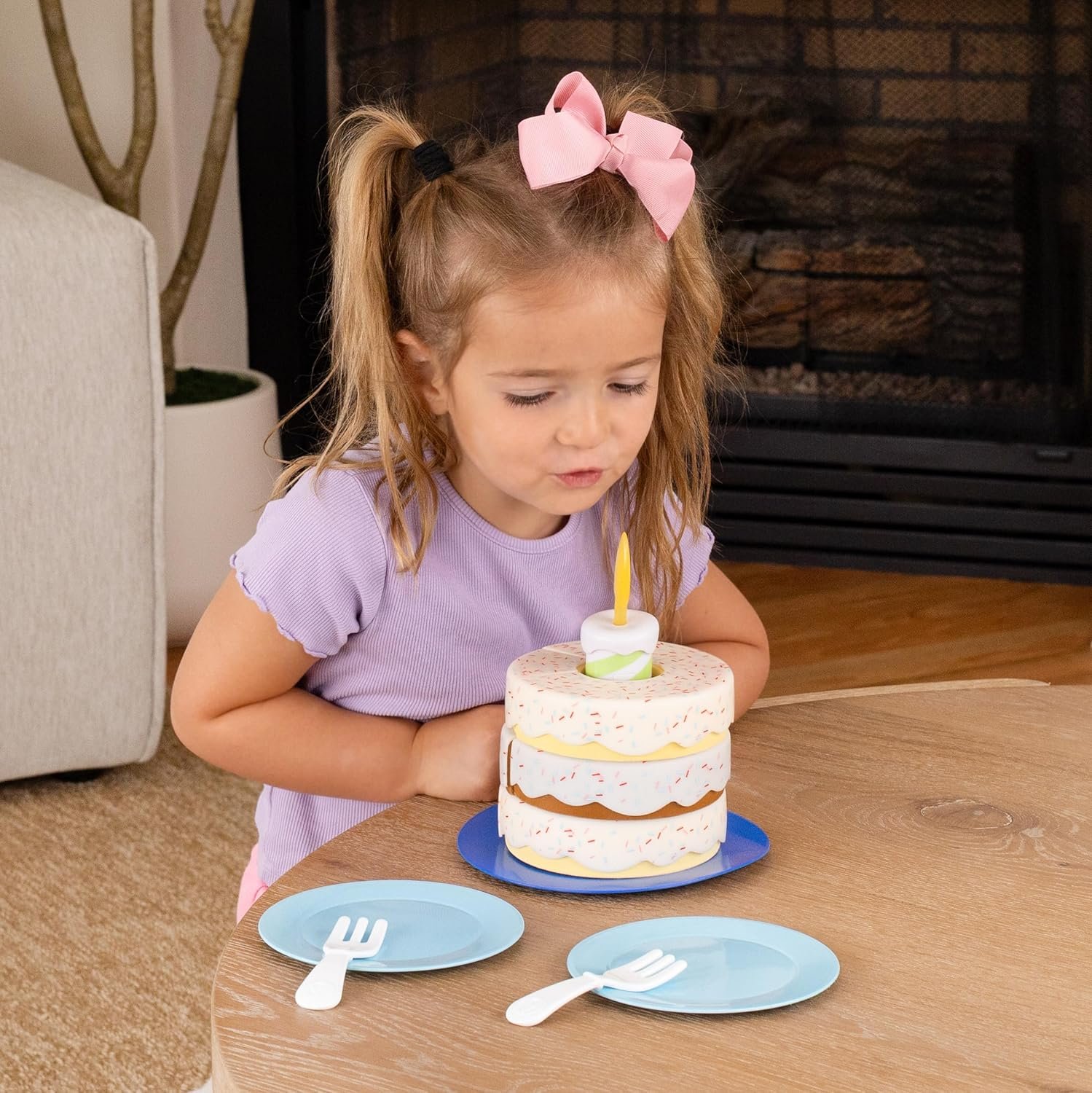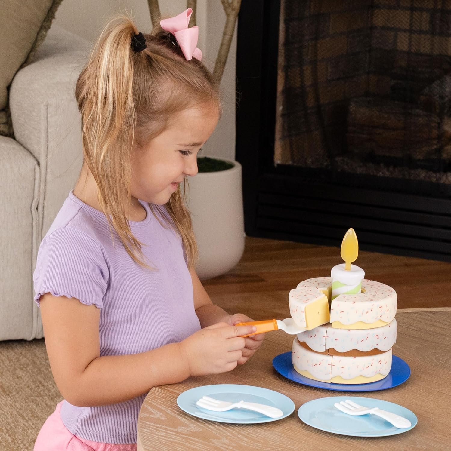 Complete 16-Piece Play Dish Set: Includes four plush cake layers, four slices, frosting, two play plates, forks, spatula, and musical candle; perfect toy dishes for kids kitchen pretend play and birthday celebrations