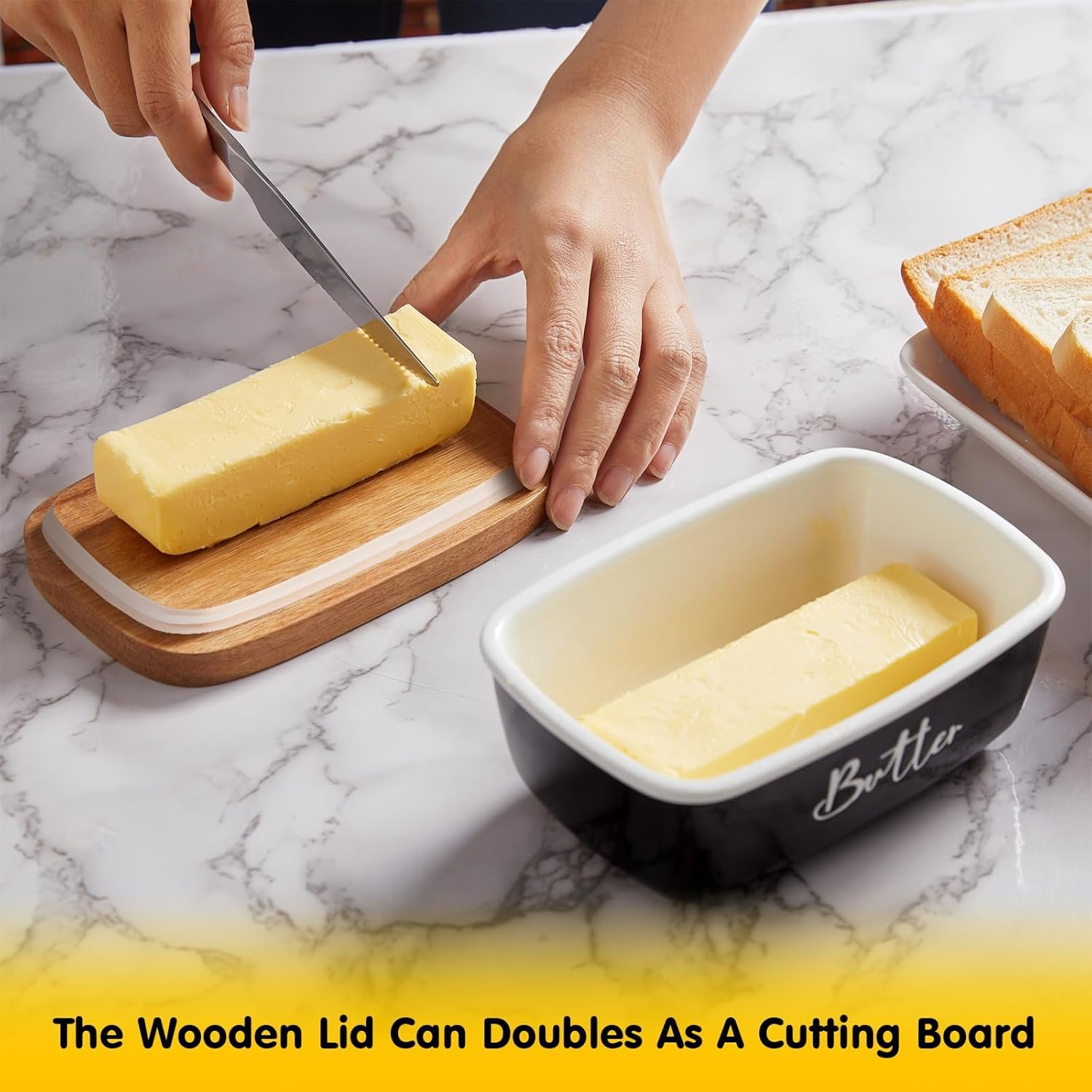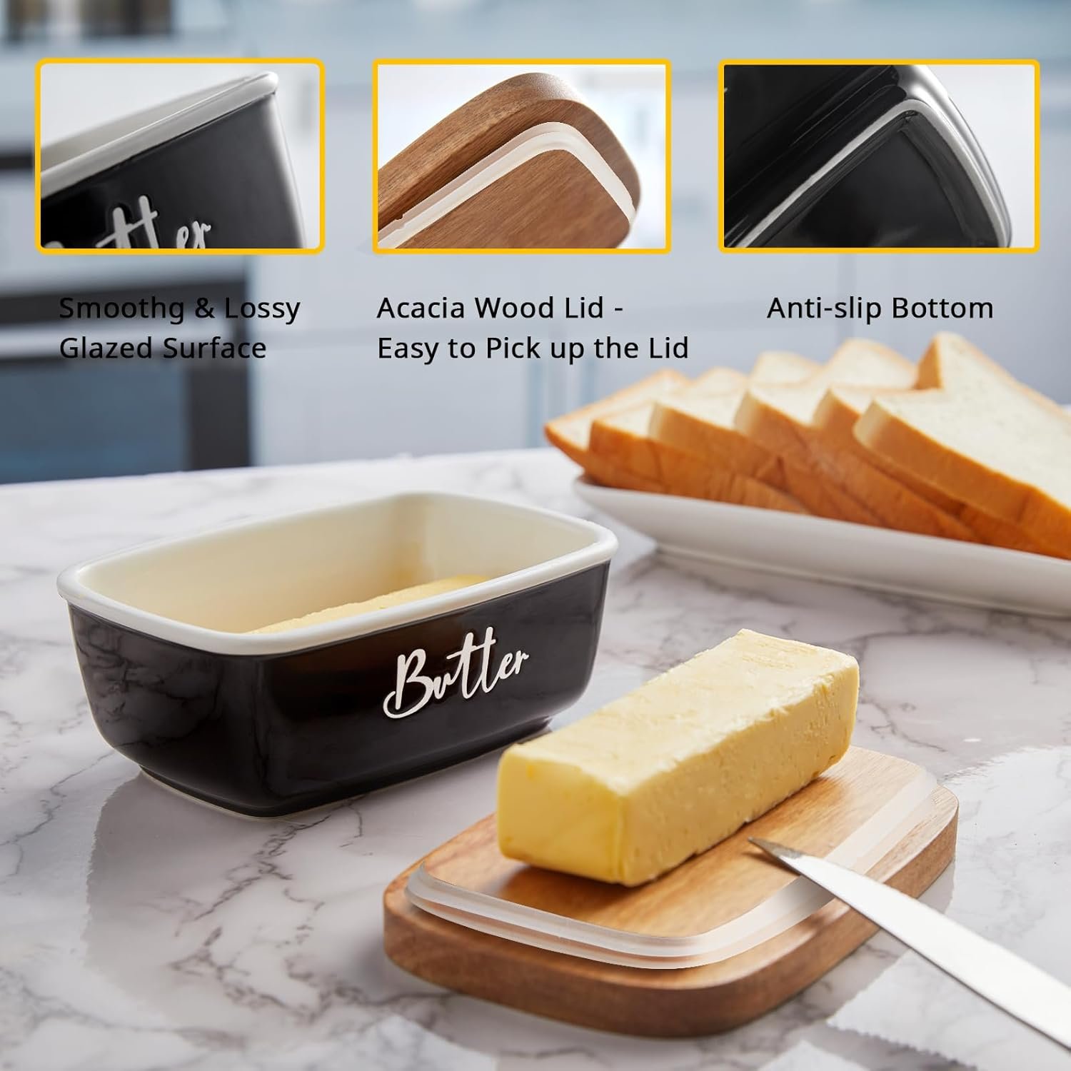 Elevate Your Kitchen Decor: The smooth ceramic combined with the dark acacia wood lid makes this butter dish a perfect complement to any modern or country-style kitchen, allowing you to enhance your country-style decor with this authentic butter dish. This retro-style butter dish will never go out of style.