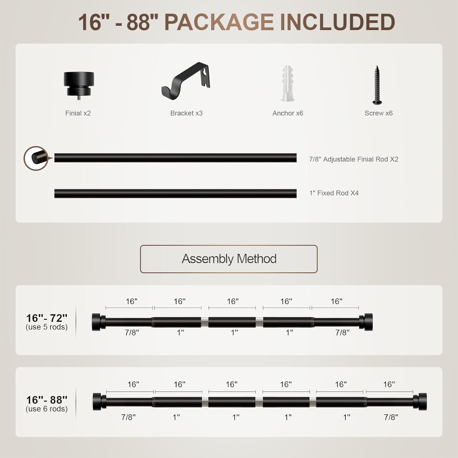 【Adjustable Curtain Rods with Brackets】This black curtain rods featuring an upgraded telescoping sectional construction, you can freely adjust the size you want by decreasing the number of fixed rods or adjust the inner rod.This curtain rod is adjustable from 16 to 88 inches.16 to 88 is the size of the curtain rod, not the window size. When choosing a curtain rod size,add 4-12 inches to your window size for the best curtain rod size for your window