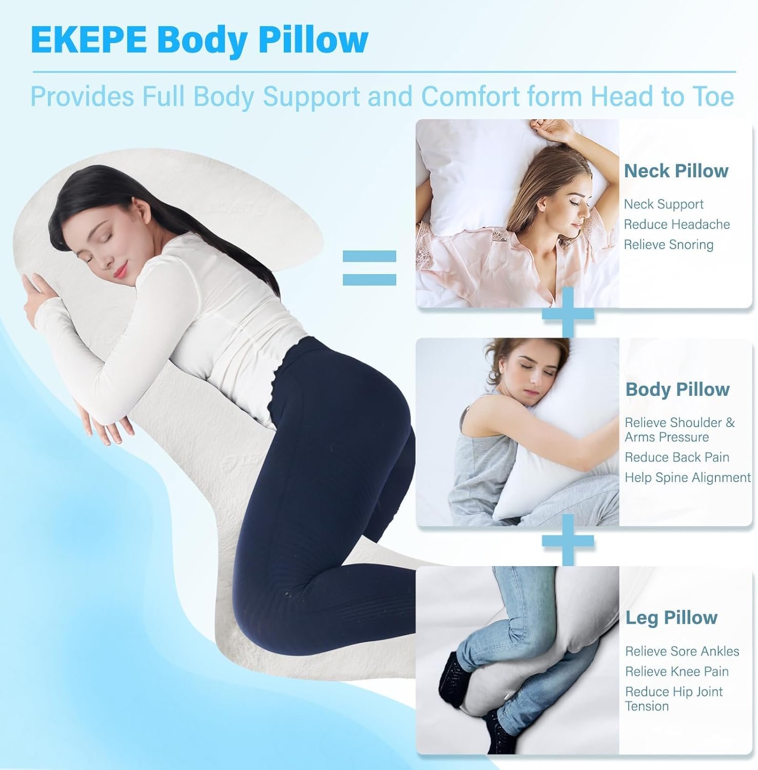 Ergonomic Support Design: Experience unparalleled comfort with the EKEPE body pillow, featuring a unique 3-shaped ergonomic design that perfectly contours to your body. This design promotes a comfortable side-sleeping position, effectively aligning the spine and alleviating pain in the head, shoulders, back, waist, hips, knees, and legs. Enjoy a luxurious sleep experience with our full body pillow all night long
