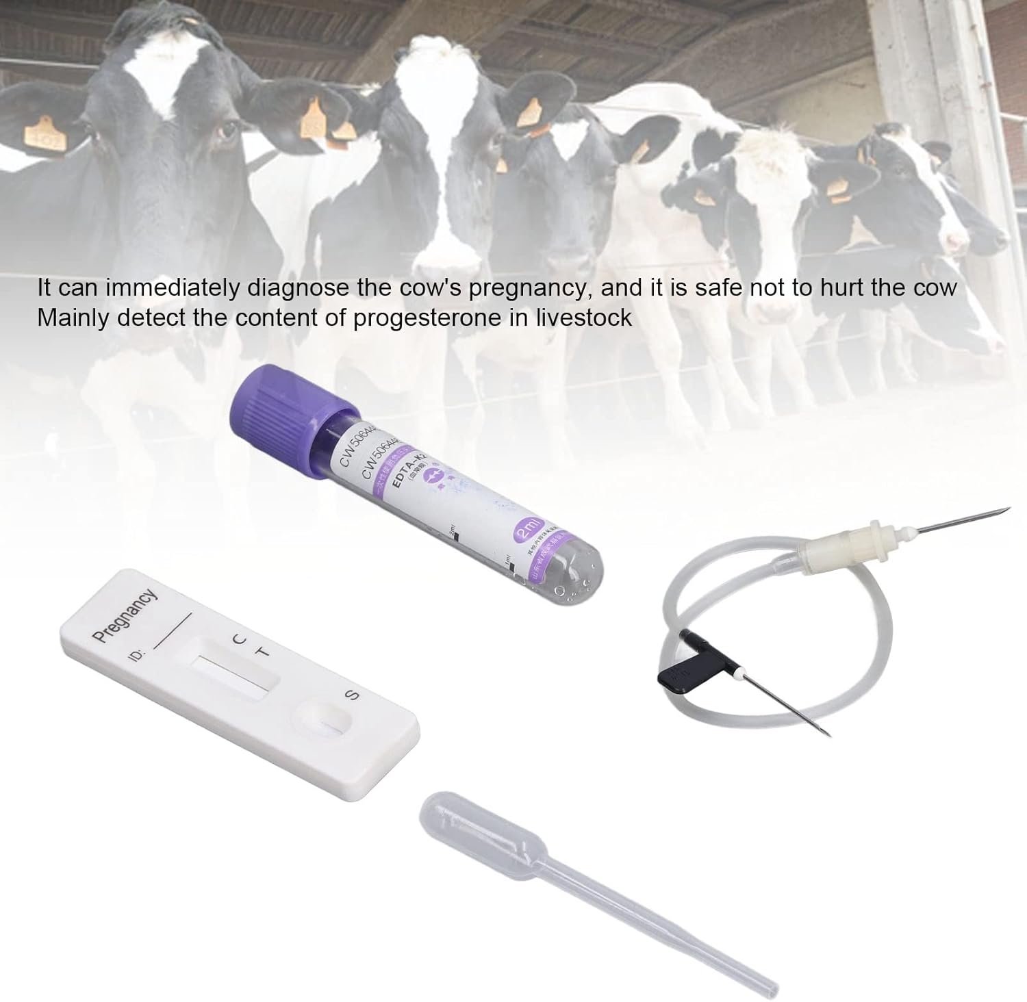 5. Fully Equipped: The bovine cow rapid early pregnant pregnancy test kit includes a test card, a dropper, a blood collection tube, and a blood collection needle.