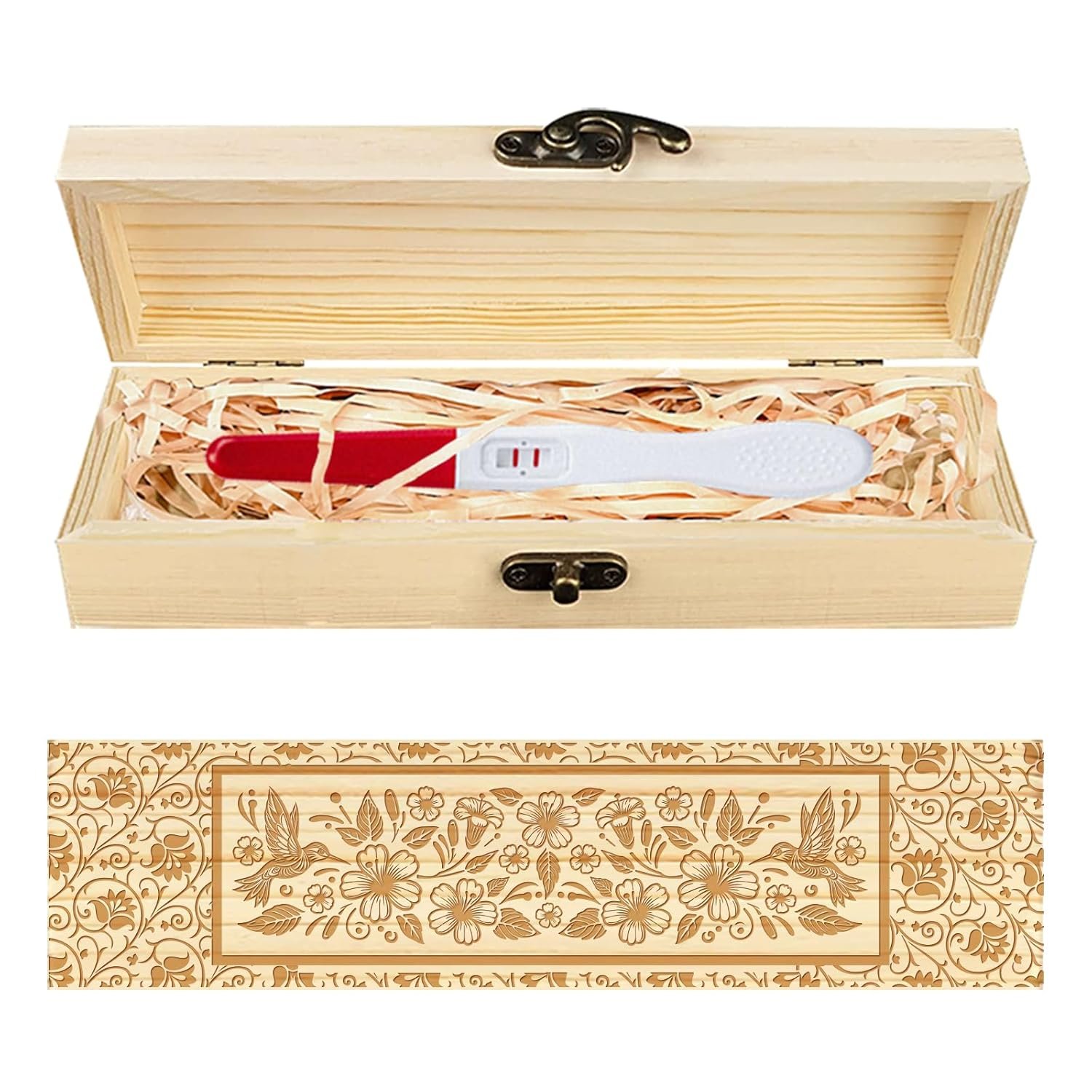 Engraved Designs: The wooden pregnancy test keepsake box is designed with vintage floral border, hummingbirds, floral and fauna engraved patterns and words, hollowed out design as the theme. This keepsake box is both beautiful and practical