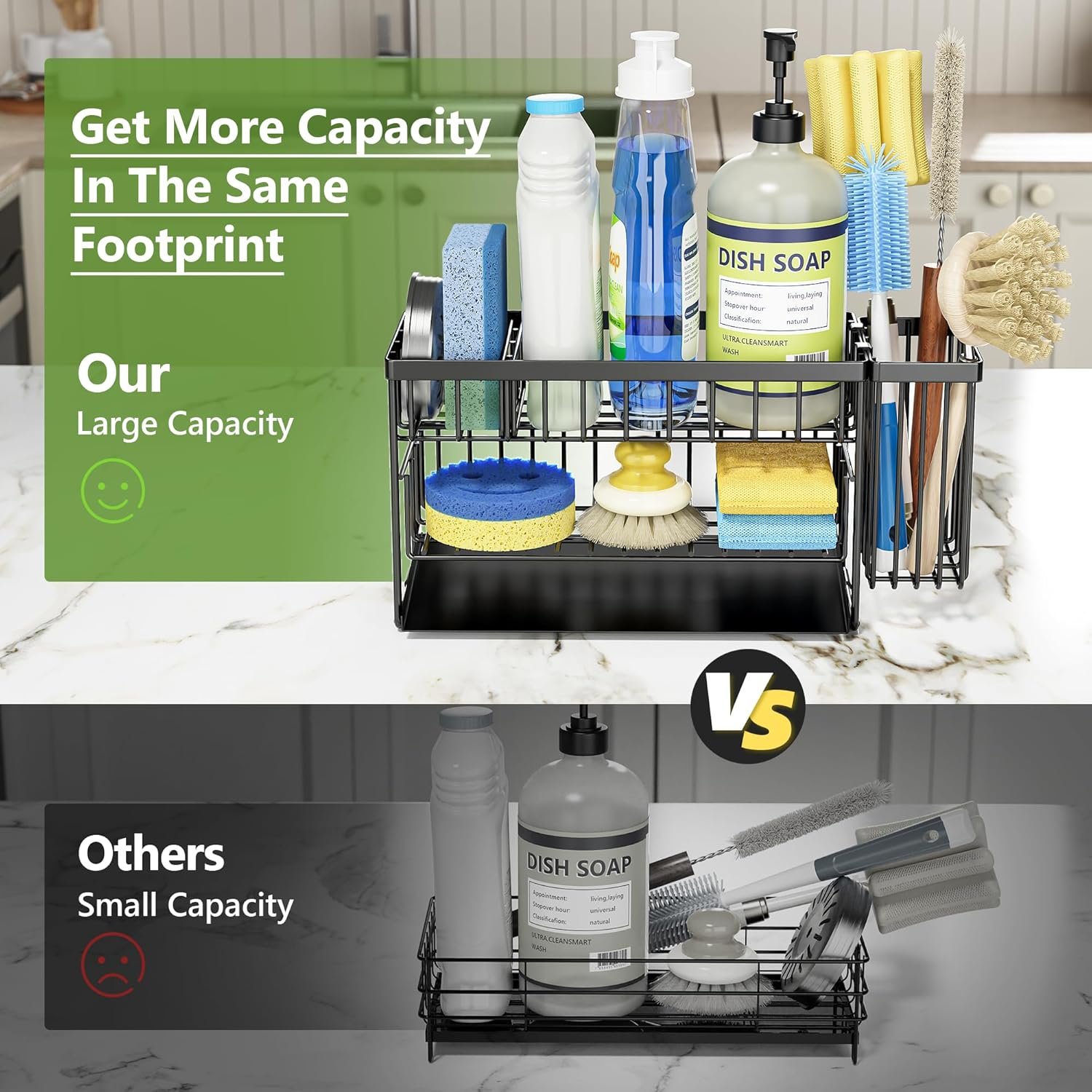 【Rustproof, Durable Stainless Steel】 Crafted from high-quality stainless steel with a rust-resistant black coating, this kitchen caddy is built to last. No bending, no rust—just long-lasting performance that looks sleek on any sink.