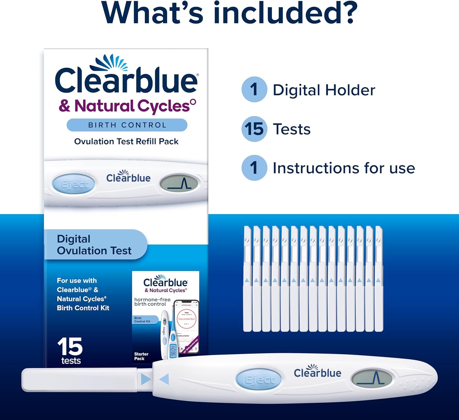 REFILL KIT CONTAINS: 15 Clearblue Digital Ovulation Tests, 1 Clearblue Reader. This Refill pack is designed to continue logging Clearblue Ovulation Test results in the Natural Cycles app. Clearblue & Natural Cycles Birth Control Kit sold separately