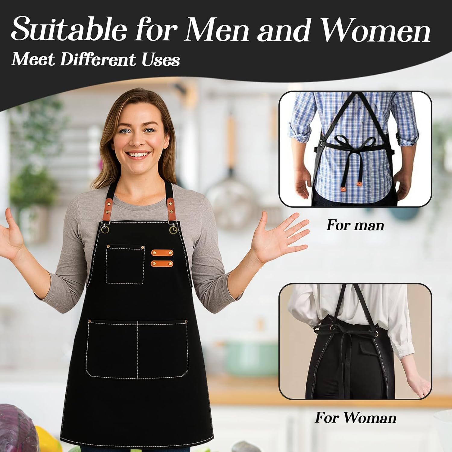 This canvas apron has very long adjustable straps and is cross backed, elastic can be adjusted, can be suitable for men, women, and tall, short, fat and thin people can be adapted.