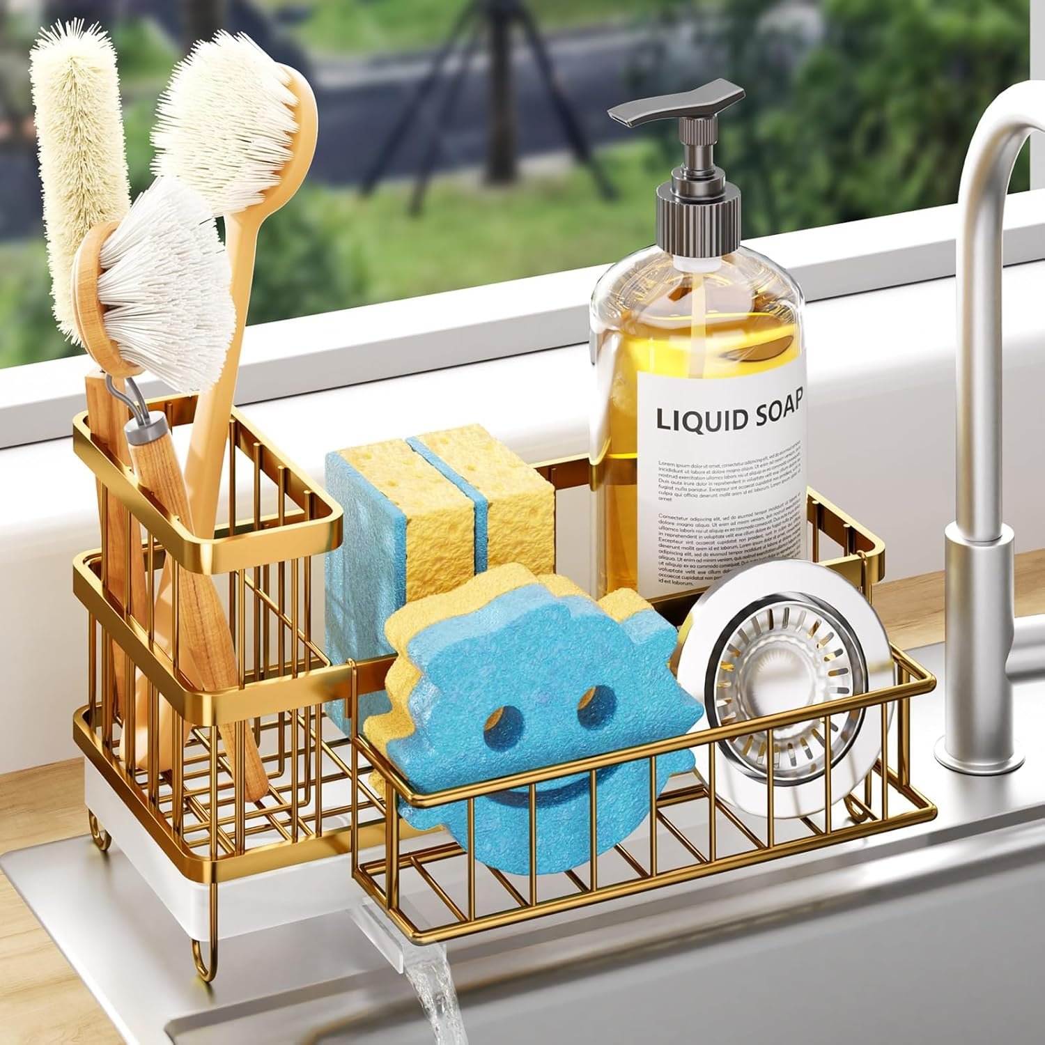 [Sturdy Stainless Steel Build]: Crafted from high-quality stainless steel, this kitchen sink caddy sponge holder offers long-lasting durability, rust resistance, and a modern sleek look. The open base keeps air flowing to help faster dry your tools