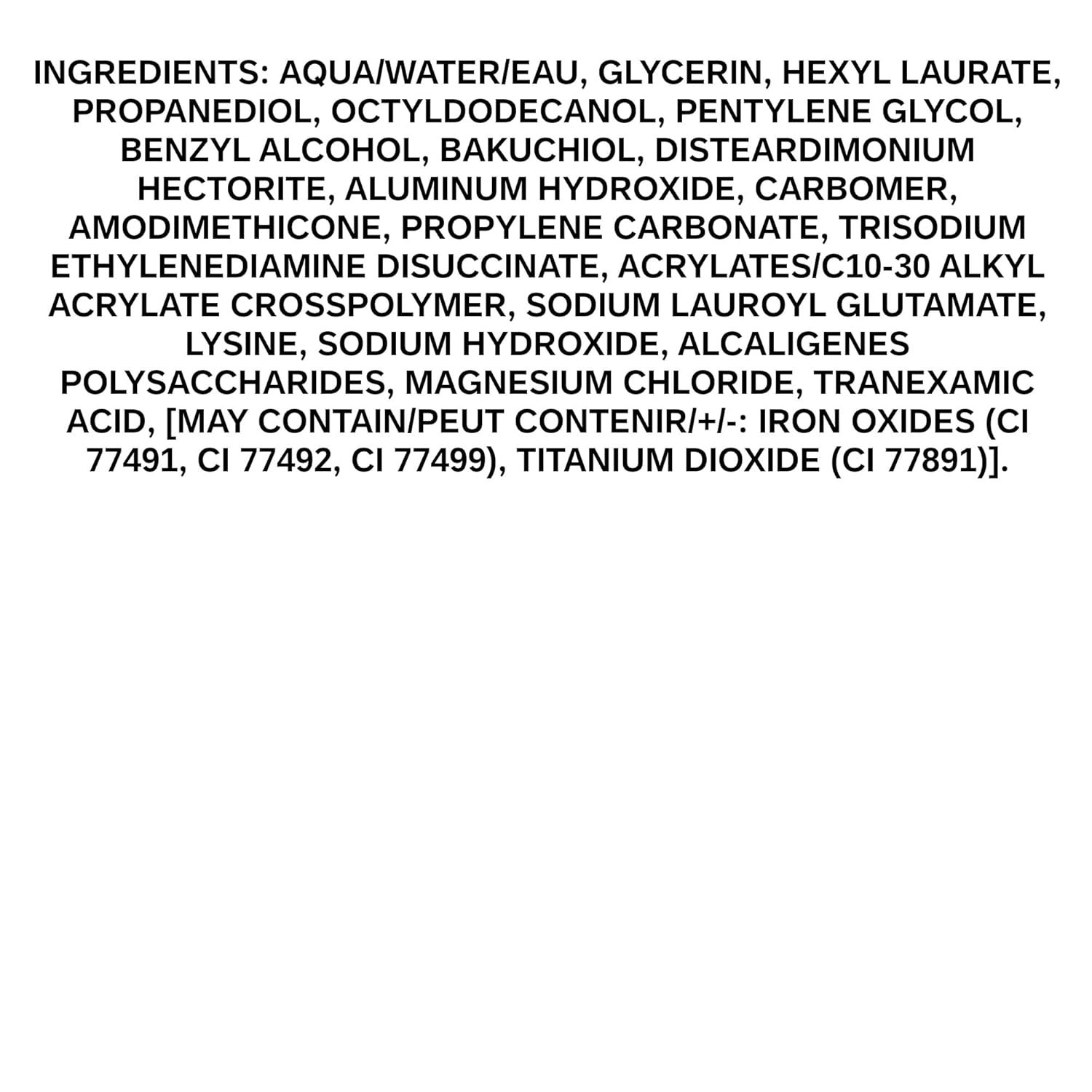 Microdroplet technology pigmented capsules blend easily to distribute a sheer, even tint for a radiant bare-skin filter effect with a refreshed and youthful appearance with a natural skin-like finish, improving complexion’s radiance, skin’s texture, suppleness and firmness after 2 weeks of use* (*Clinical study on 30 females; clinical grading evaluation after daily application for 2 weeks)