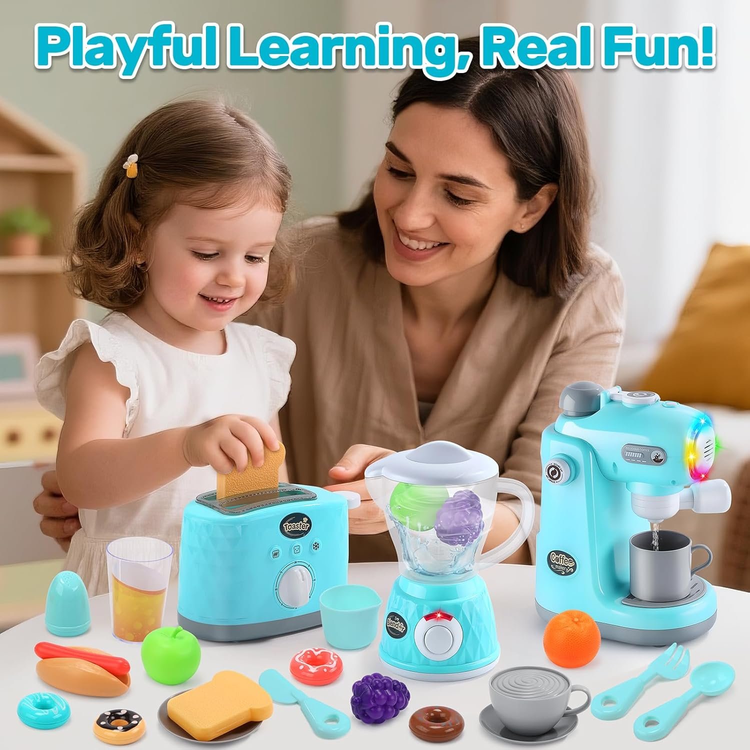 All-in-One Pretend Kitchen Set with REAL WORKING FUNCTIONS: Our Play Kitchen Appliances Set sparks endless imagination by combining multiple interactive appliances in one! This engaging set features a coffee maker with realistic flowing water, sound & light effects, a spinning blender with a rotating blade, and a pop-up toaster that jumps when the timer dings. Plus, it includes pretend food, cups, and spoons for a complete role-playing experience right out of the box.