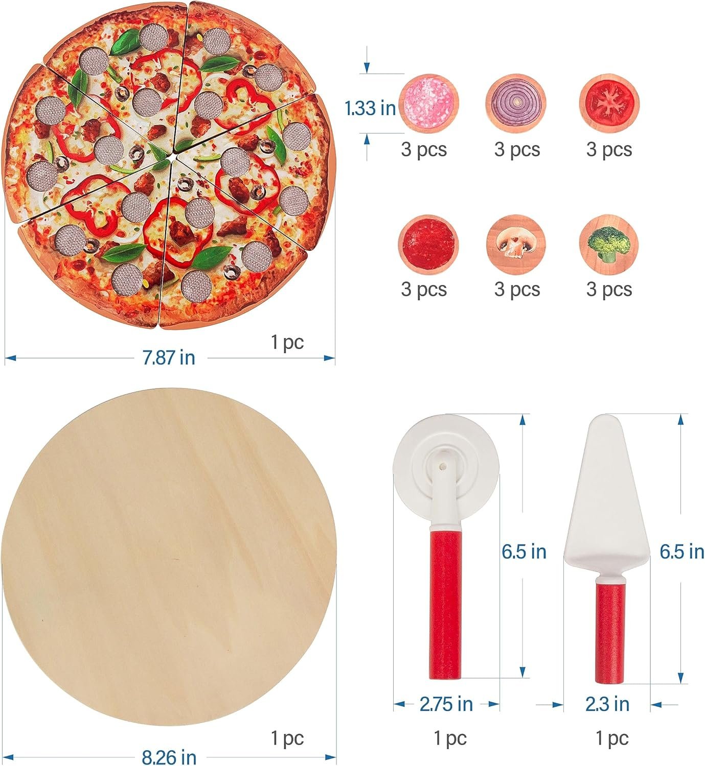 PRETEND PLAY PIZZA TOY:This wooden Puzzle is made of 100% non-toxic wood with food-grade water paint, child-safe, as well as eco-friendly. Cook up some fun with 4 wooden slices with 12 toppings, Self-stick tabs hold 4 sliceable wooden pizza slices together.Ideal gifts for Boys and Girls age 2 3 4.