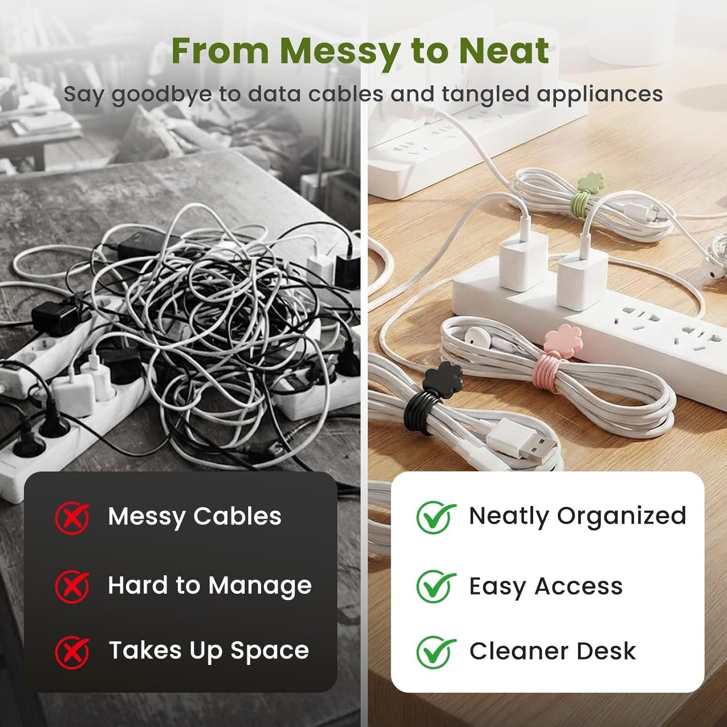 π Multipurpose Cord Management β Ideal as cord ties, cord clips, or cable clips, they help bundle and secure charging cables, headphone cords, or any wire clutter efficiently.