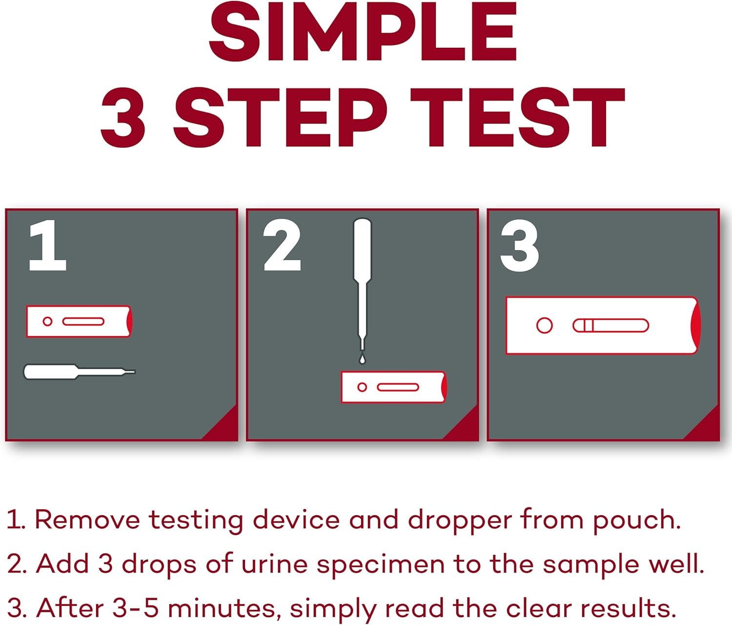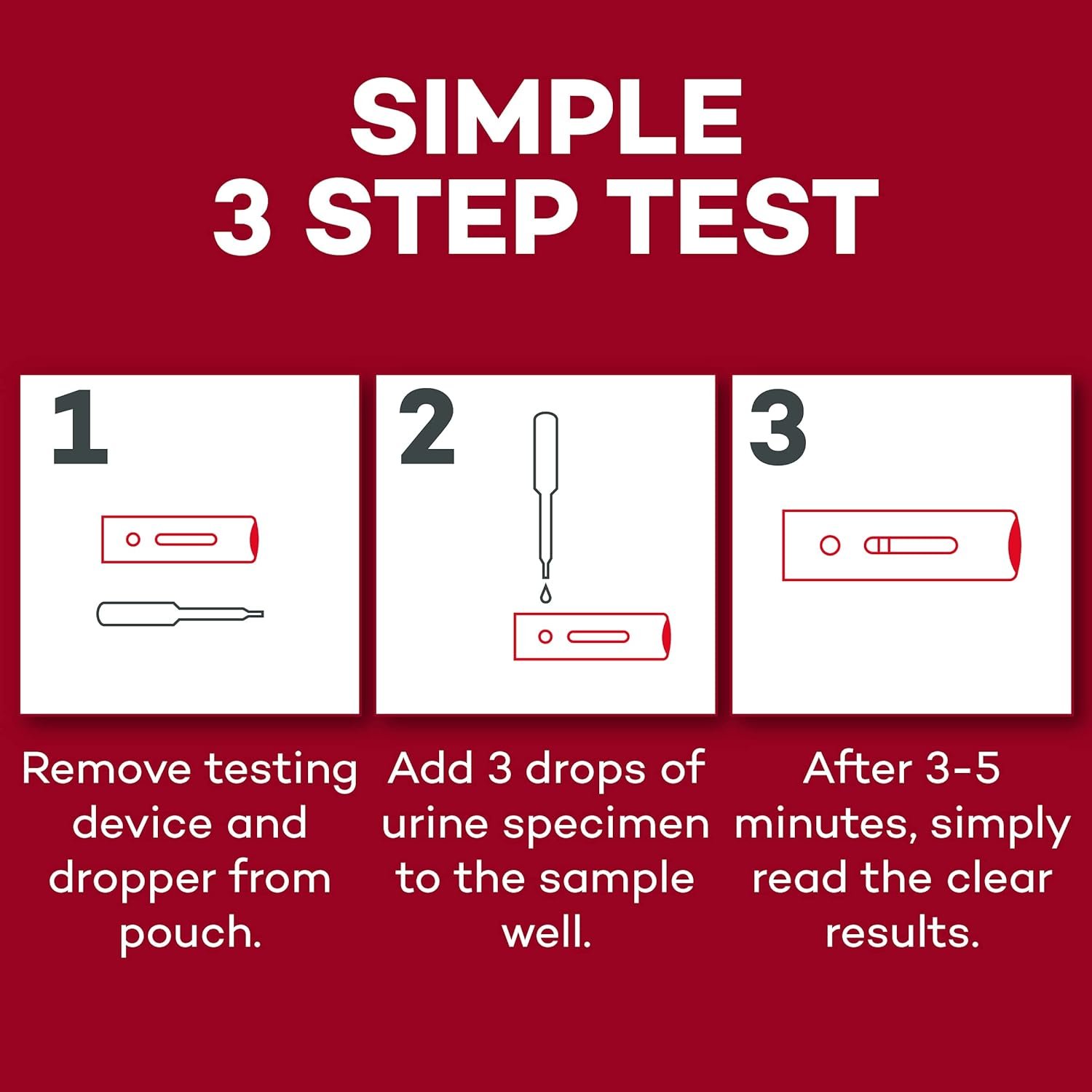 In just three easy steps, your early result pregnancy test will be ready to read. Remove testing device and dropper from pouch. Add 3 drops of urine specimen to the sample well. Read the clear results.
