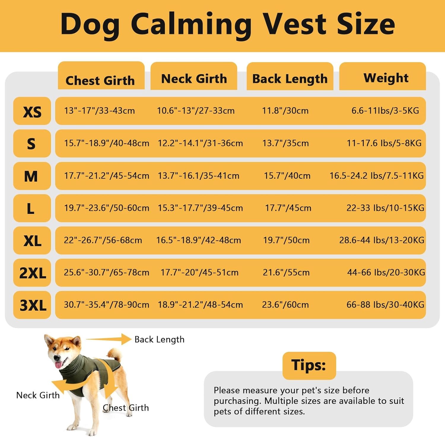 4 Sizes Available: Dog anxiety jacket has 4 sizes to select (L-3XL), suitable for small medium large dogs. Before purchasing our anxiety shirt for dogs, please measure your dog’s size and compare it with the size chart. If you have any questions, please let us know and we will get back to you as soon as possible.