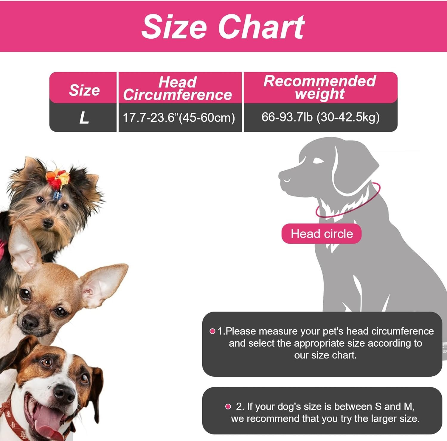 Suitable dog neck circumference: Size M is suitable for dogs with a head circumference of 35-48 cm/13.77-18.99 inches and a recommended weight of 35-60 catties/38.58-66.13 lbs; Size L: Size L is suitable for dogs with a head and tail circumference of 45-60 cm/17.71-23.63 inches and a recommended weight of 60-85 catties/71.65-93.69 lbs.