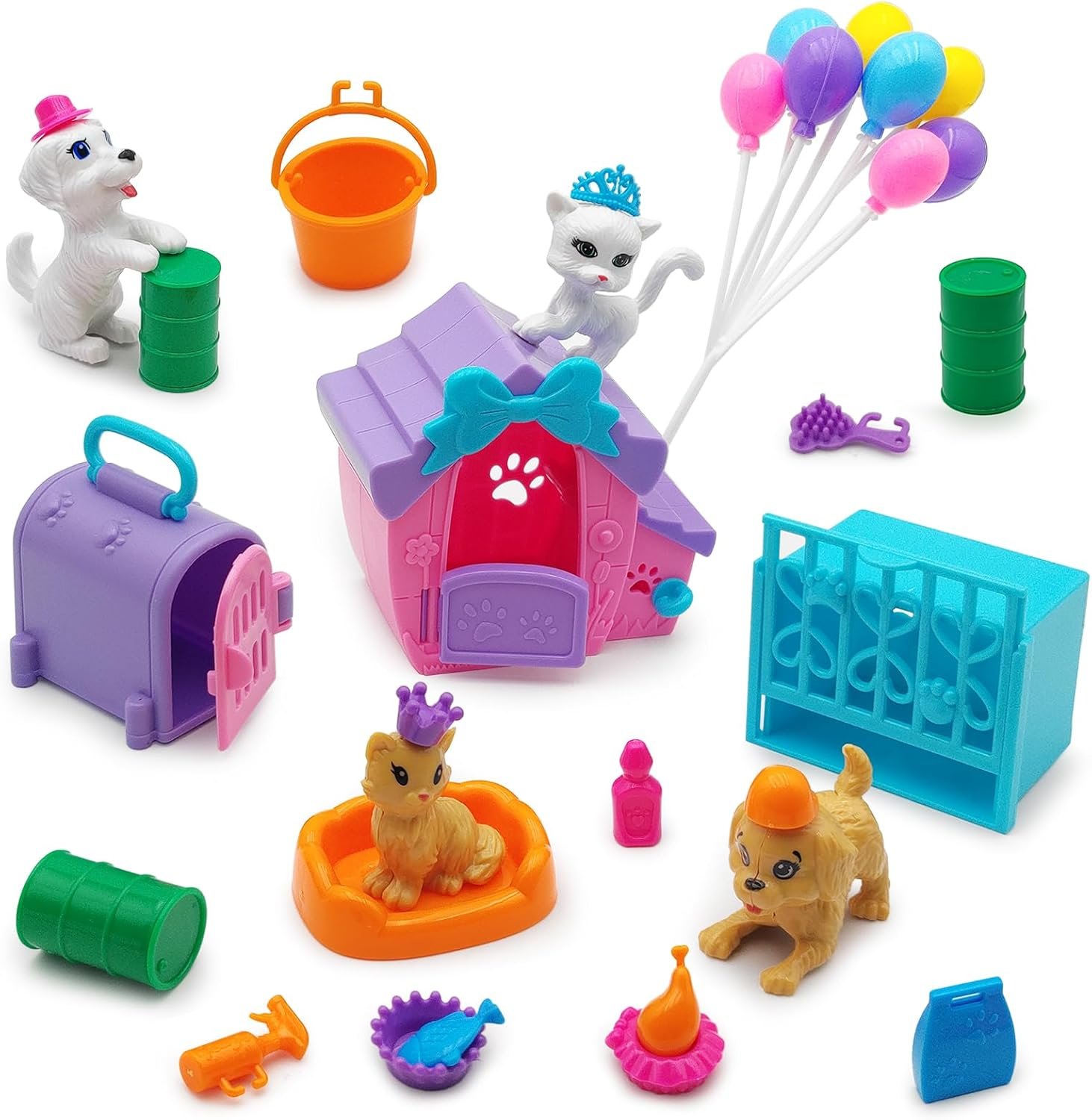 Doll accessories pet care:1 house,2 cage,1 mat, 2 dogs, 2 cat, 1 bucket, 3 rollers, 1 bundle of balloons,1 set mini feeding set,4 headwears for animals) Pet Care Center Play Set.