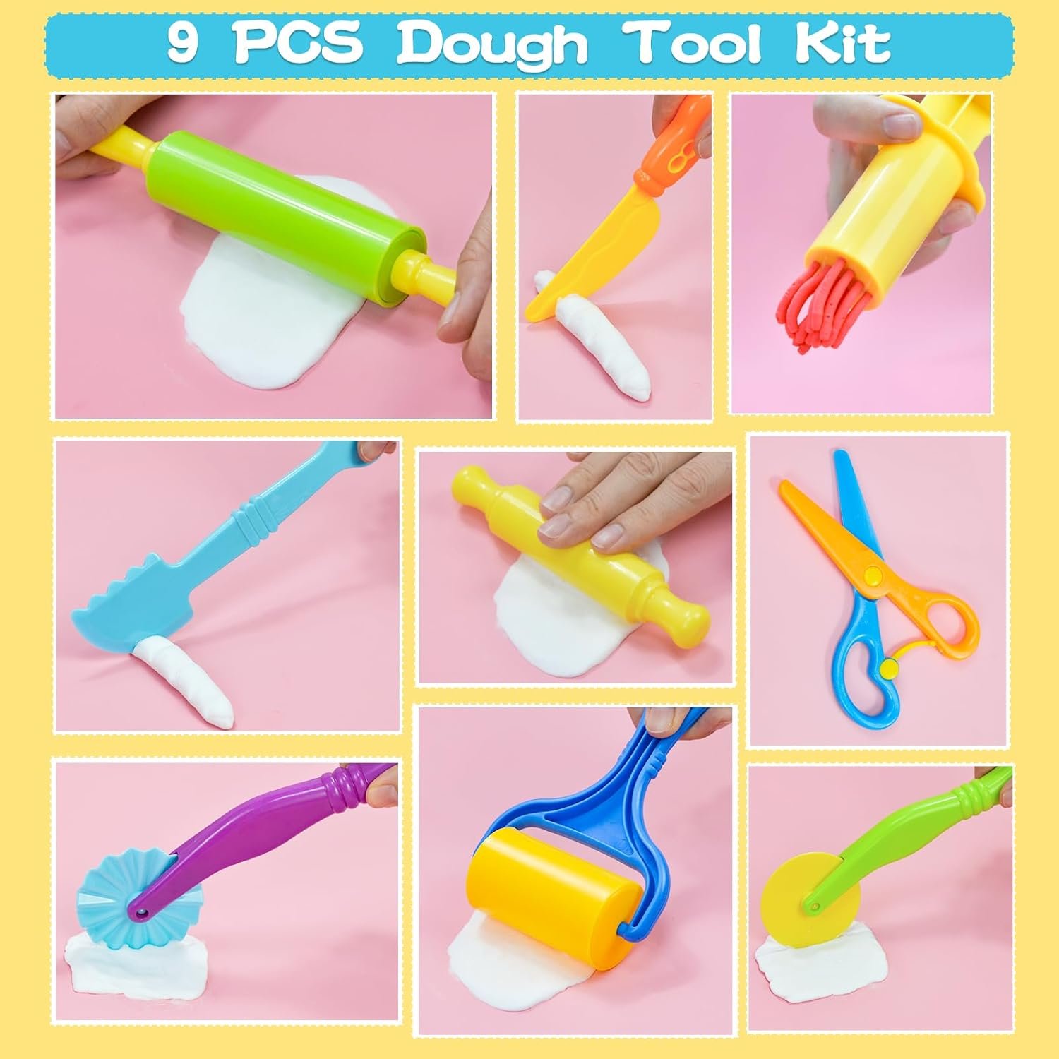 Dough Tool Set, 9 Pcs Dough Tools Sets for Kids Ages 4-8, Dough Accessories Includes Cutters Roller, Rolling Pins, Safety Scissors, Plastic Knife, Plastic Rollers