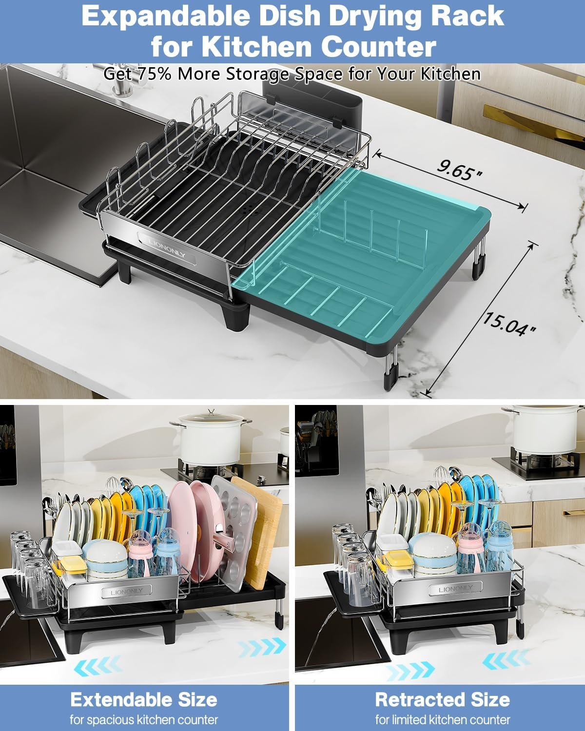 【Expandable Design — 100% More Storage Space】:LIONONLY’s newly Expandable Dish Drying Rack includes a same-size multi-function extension drainboard. You can flexibly expand the drying area as needed to meet the storage demands of larger households.
